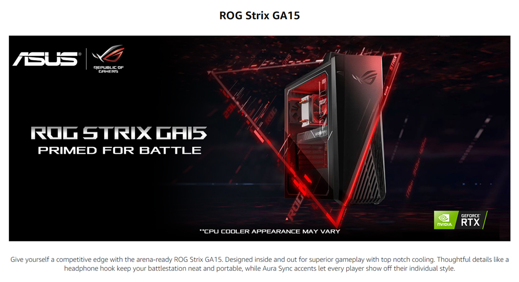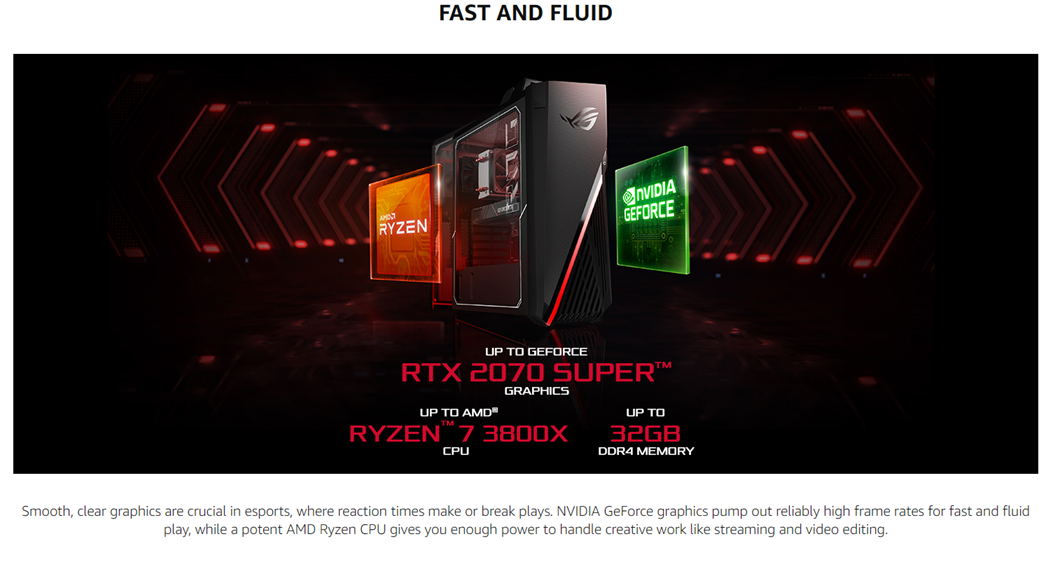 ROG Strix GA15DH Gaming Desktop PC, AMD Ryzen 7 3800X, GeForce RTX 2070 SUPER, 16GB DDR4 RAM, 512GB PCIe SSD + 1TB HDD, Wi-Fi 5, Windows 10 Home, GA15DH-AH772