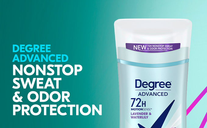 Degree Advanced Lavender and Waterlily Antiperspirant Deodorant lets you face the day with confidence. This antiperspirant for women features 72-hour sweat and odor protection and the relaxing, floral scent of lavender and waterlily. Only Degree has MotionSense technology that moves in sync with your body. This antiperspirant deodorant releases a burst of subtle fragrance every time you move, for nonstop protection. Degree Lavender and Waterlily deodorant for women keeps you feeling fresher, drier, and more confident. This powerful antiperspirant deodorant responds when you need it most, so you don't have to worry about slowing down. Simply swipe and start moving. This antiperspirant deodorant for women with a relaxing scent gives you the confidence to keep moving all day long. Degree Lavender and Waterlily Antiperspirant Deodorant keeps you feeling cool, fresh and protected from sweat and odor. Degree gives you the confidence to keep moving, however you move. Lavender and Waterlily also comes in an antiperspirant deodorant dry spray. At Degree, we’re doing everything we can to help keep the planet moving. That’s why we're increasing our use of reusable materials, making it easier for you to recycle our antiperspirant and dry spray packaging. Whatever you do, however you do it, Degree wants to help inspire the confidence in you to move more, and with this antiperspirant deodorant, it’ll provide you the confidence that sweat and odor will not get in your way of your progress. Degree. It won’t let you down.