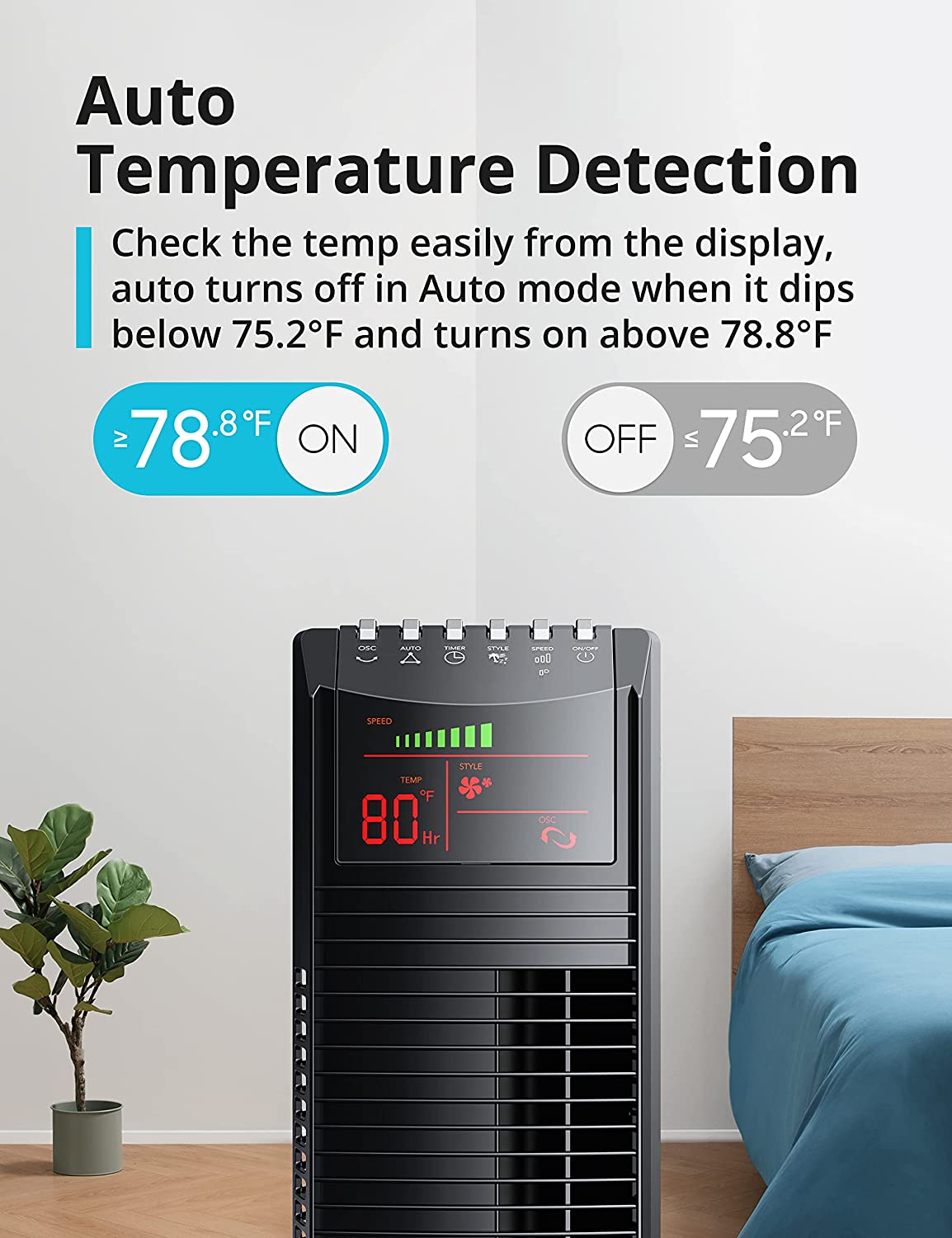 - Safe & Reliable: With ETL certification, the standing fan is safe for you and your family to use as the narrow fence protects children and pets, and the oscillating tower fan automatically turns off for your health when the ambient temperature is lower than 24°C / 75.2°F