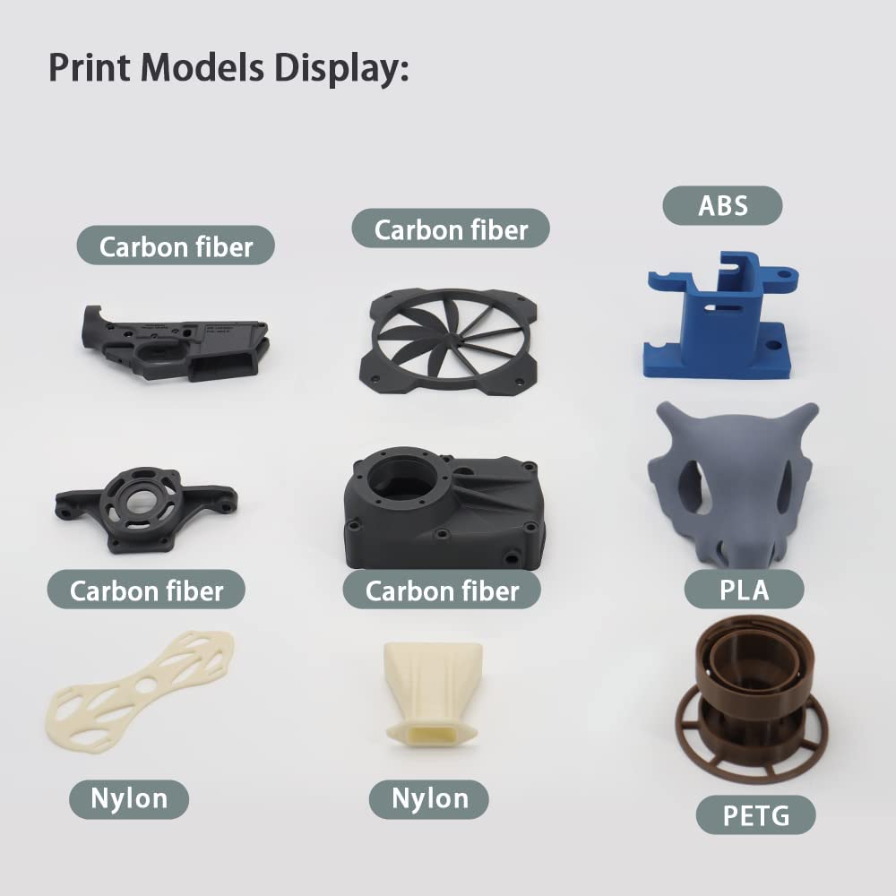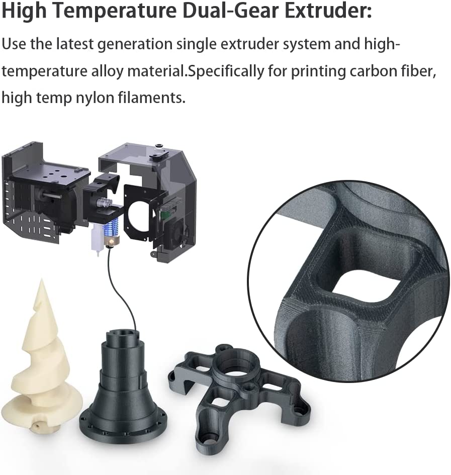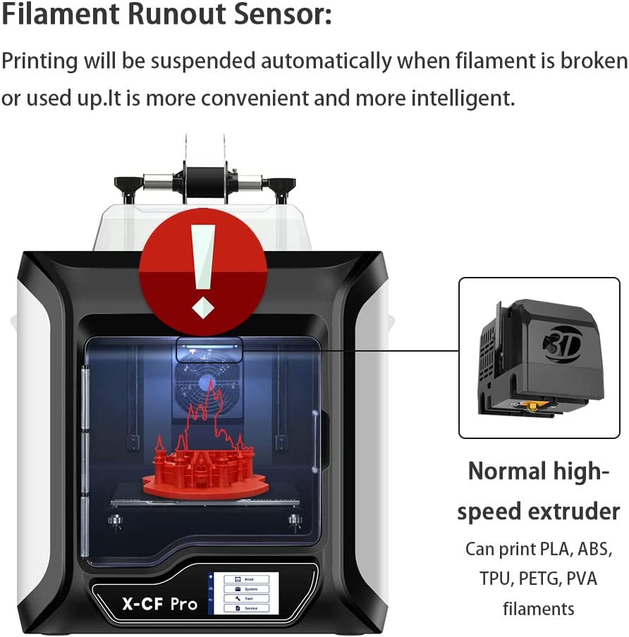 • 【Design Concept】X-CF PRO is a 3d printer specially designed for printing carbon fiber and nylon filaments.Independent research and development of the latest generation single extruder system, which uses high-temperature alloy material, dual-gear extrusion, can solve the problem of the accuracy is not very accurate or service life is not long when printing carbon fiber. Another set of normal high-speed extruder can easily print PLA, ABS, PETG and other filaments.