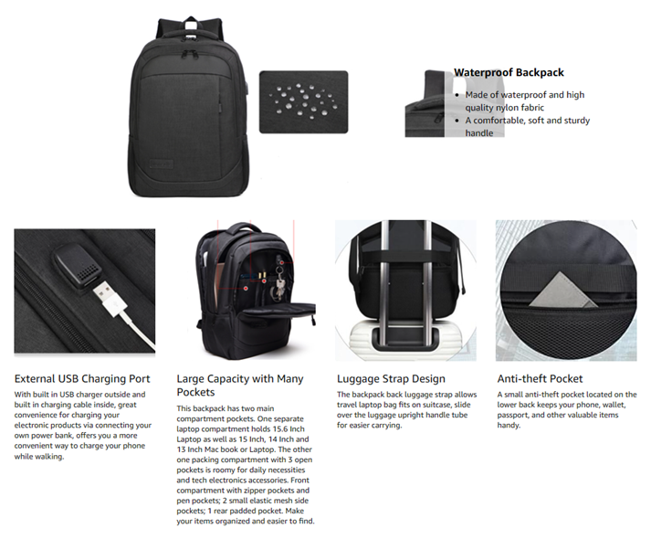 • LARGE CAPACITY&MANY POCKETS: This backpack has two main compartment pockets. One separate laptop compartment holds 15.6 Inch Laptop as well as 15 Inch, 14 Inch and 13 Inch Mac book or Laptop. The other one packing compartment with 3 open pockets is roomy for daily necessities and tech electronics accessories. Front compartment with zipper pockets and pen pockets; 2 small elastic mesh side pockets; 1 rear padded pocket. Make your items organized and easier to find.