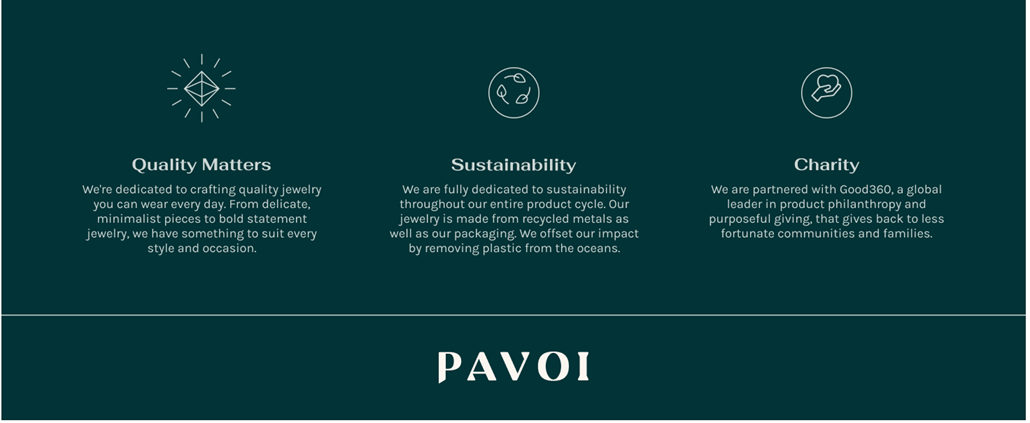 • ✦ SUSTAINABILITY ✦ PAVOI is dedicated to sustainability throughout our entire product cycle. Our jewelry is made from 100% recycled materials and we package in 99% recycled and compostable materials. We work to reduce our carbon emissions and offset plastic consumption by removing 275,000 bottles from oceans annually. We are committed to maintain a balanced and eco-friendly business that minimizes our environmental impact. Trust that PAVOI is continuously working towards a greener future.