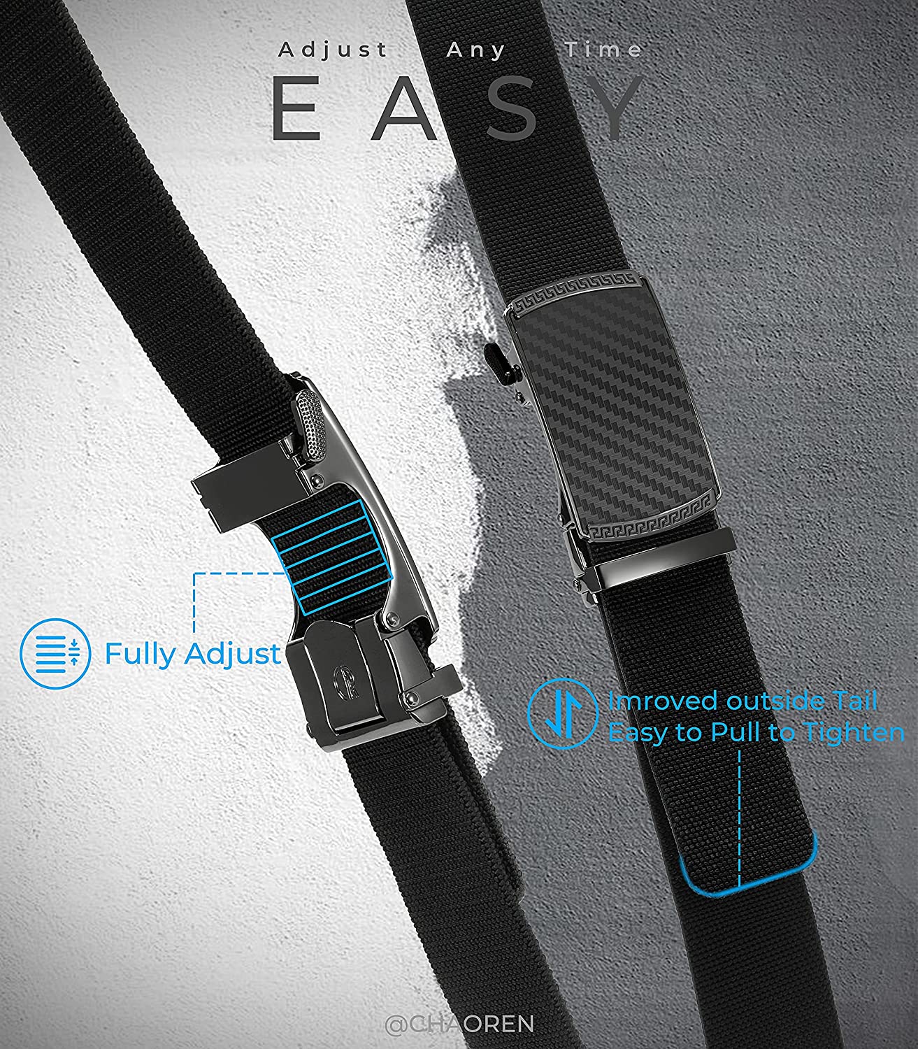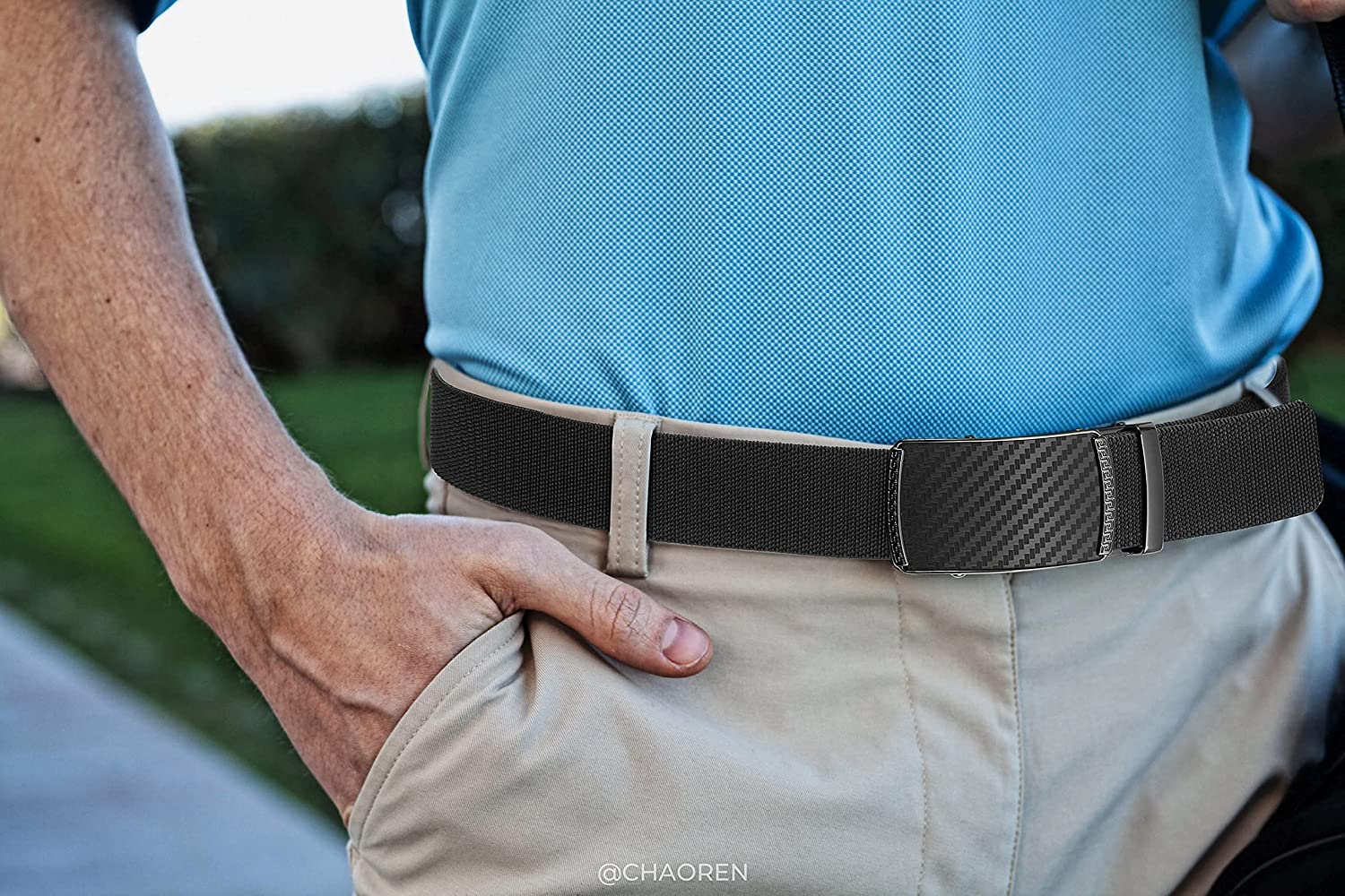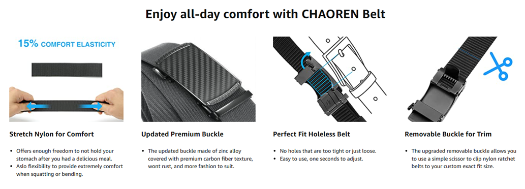 • ?【Maximum Durability】: The buckle is made zinc alloy and covered with carbon fiber texture, anti-rust & anti-scratch. Also CHAOREN stretch golf belts are 30% thicker than the normal webbing belt , enough to withstand daily wear and tear.