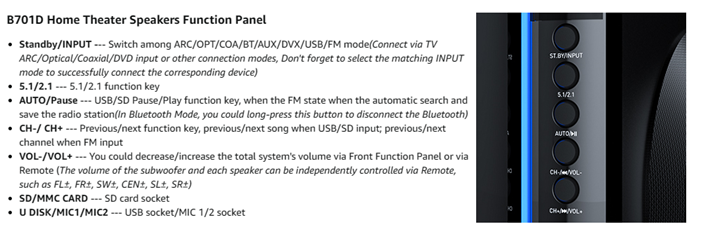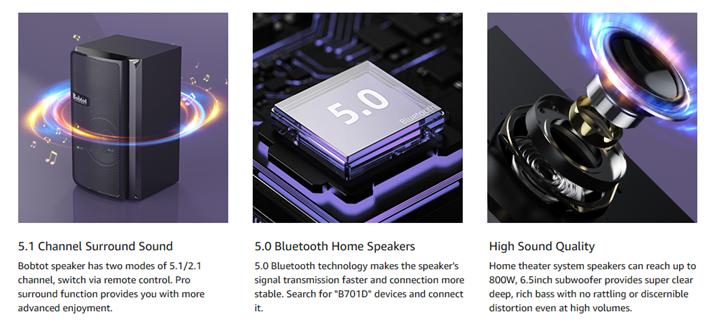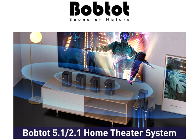 - 5.1 Channel Surround Stereo Sound: Bobtot surround sound system has two modes of 5.1/2.1 channel, switch via remote control or front panel. Pro surround function provides you with more advanced enjoyment. Via the Remote you can also independently control the volume of each speaker and the subwoofer