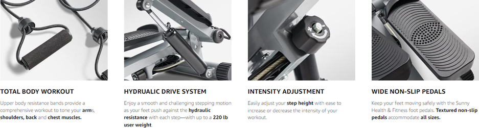 • HYDRAULIC DRIVE SYSTEM: Built with a hydraulic drive system this workout machine provides a smooth stepping motion. Arrives assembled (simply attach resistance bands).