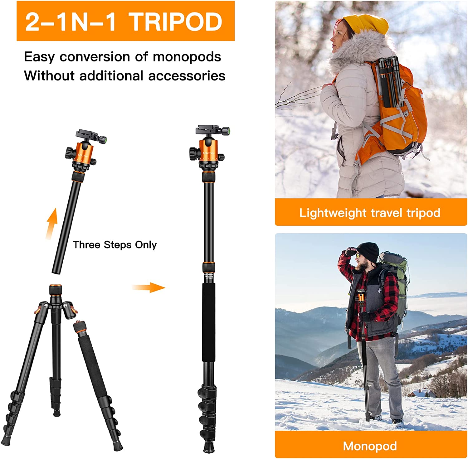 • 【Multi-functional Monopod】 A foam-cushioned, removable leg attaches to the center column to convert to full size 80 inches monopod with seconds. It can be used as a one-handed shooting artifact, or as a trekking pole when climbing or hiking