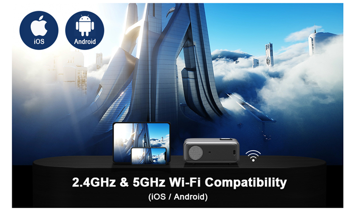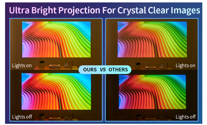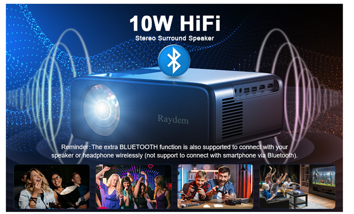- ?【HiFi Speakers & Low-noise Radiator Fan: 】 We have built-in 10W dual stereo speakers with a HiFi system for a great auditory sense experience. Listen to what you want, not what you don’t with the projector’s optimized low-noise radiator fan, it has a 20% reduction in noise compared to competitors. And because of this improved fan it also helps to extend the life of the projector to 50,000 working hours.