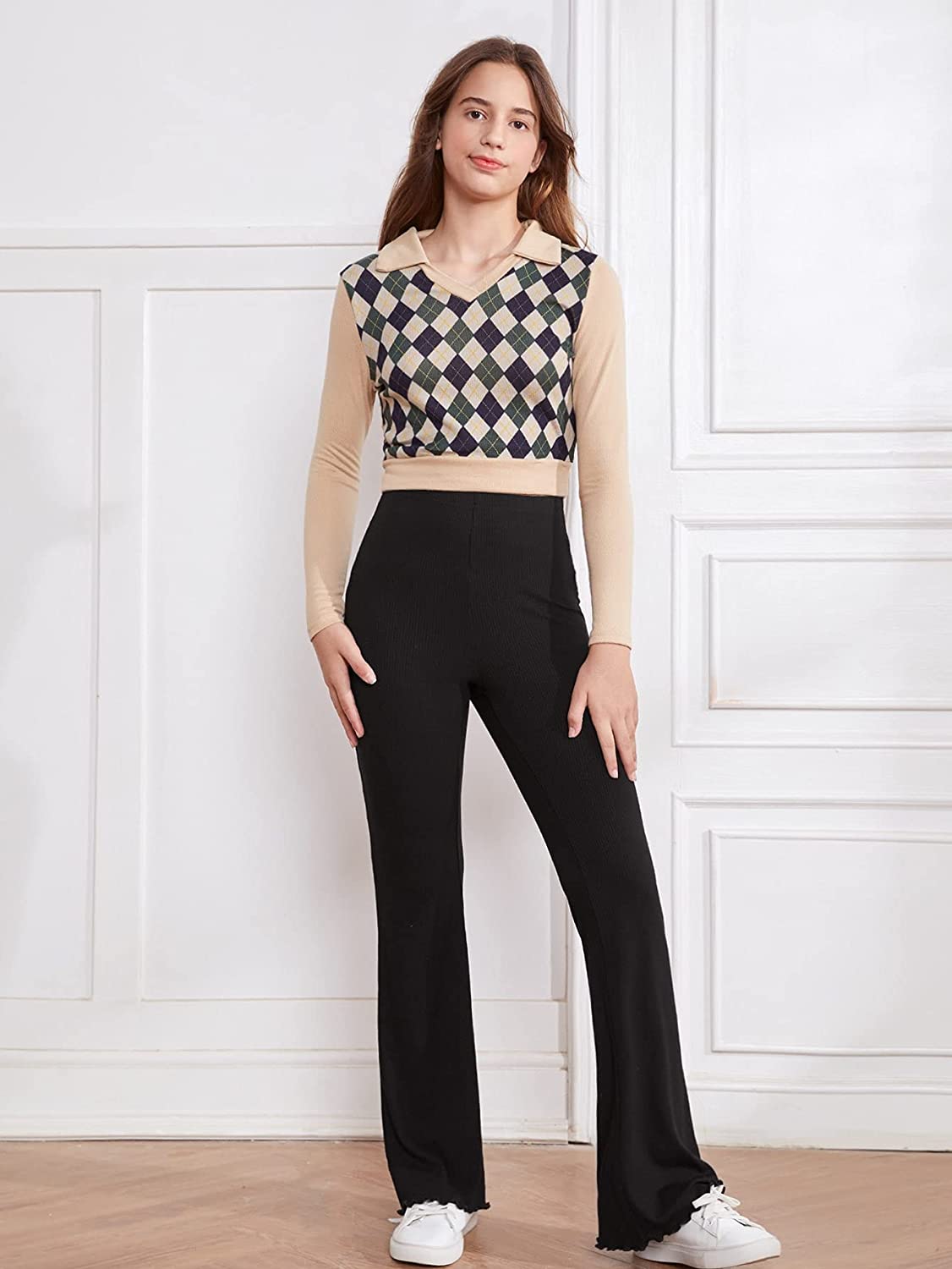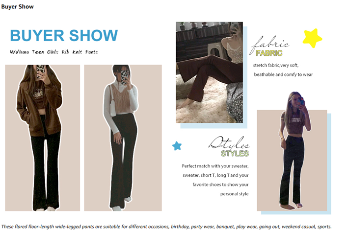 Features: elastic high waist, ribbed, long pants, flare, horn leg, lace hem.