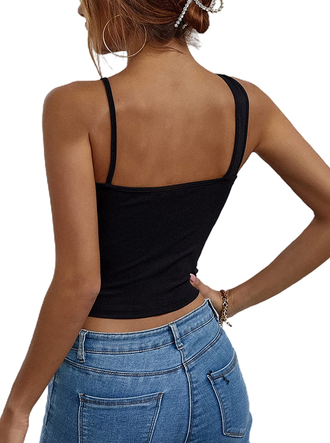 Remidoo Women's Sexy Strap Asymmetrical Neck Cutout Ribbed Knit Slim Fit Cami Crop Top