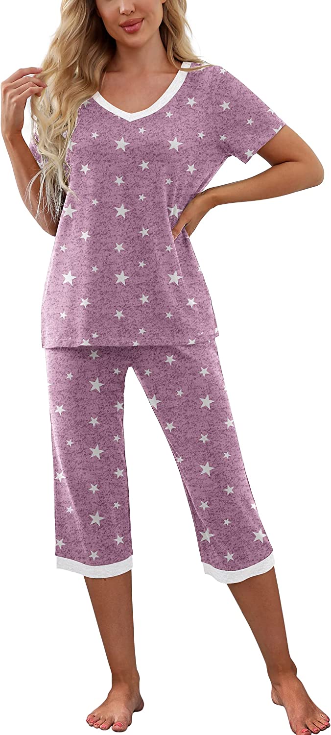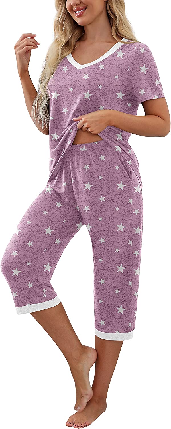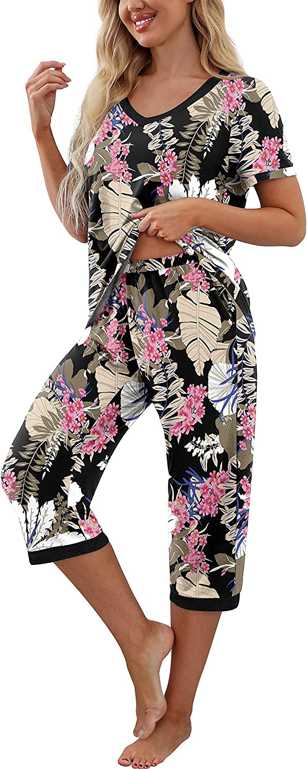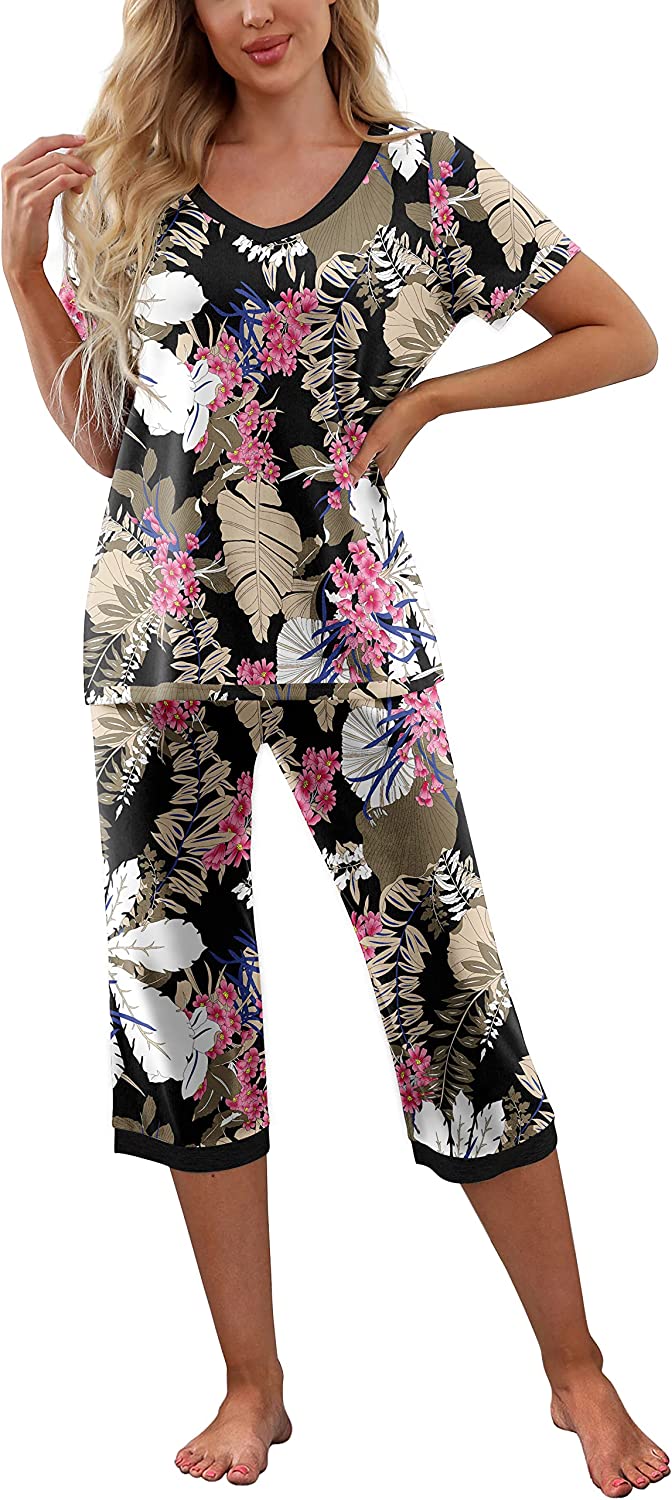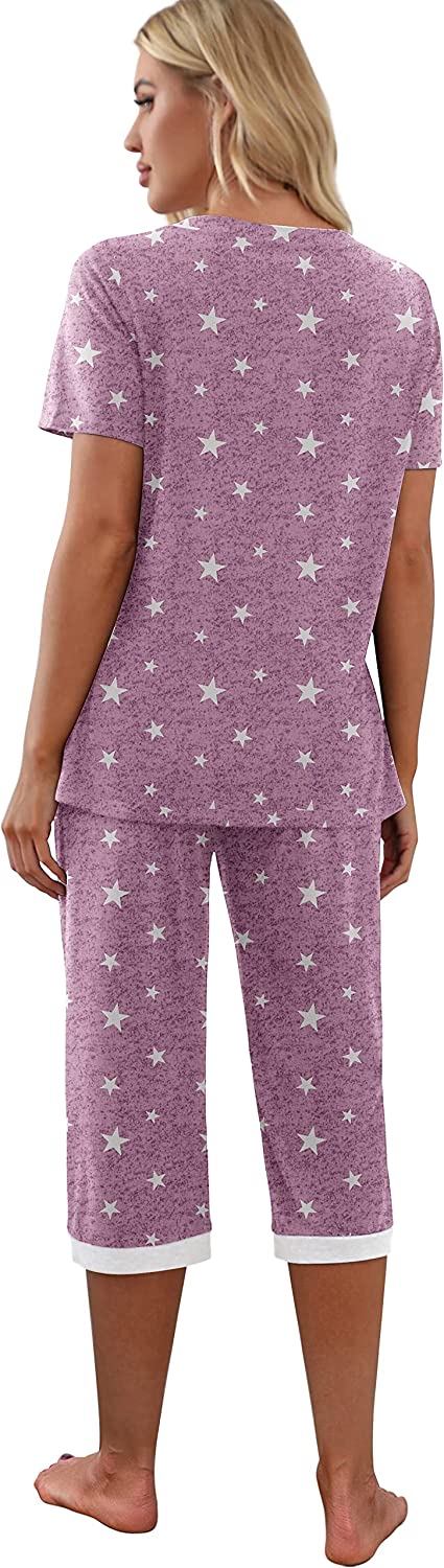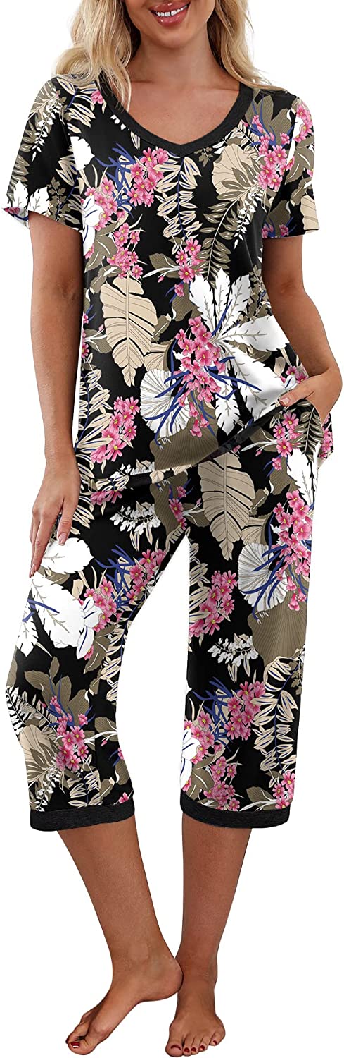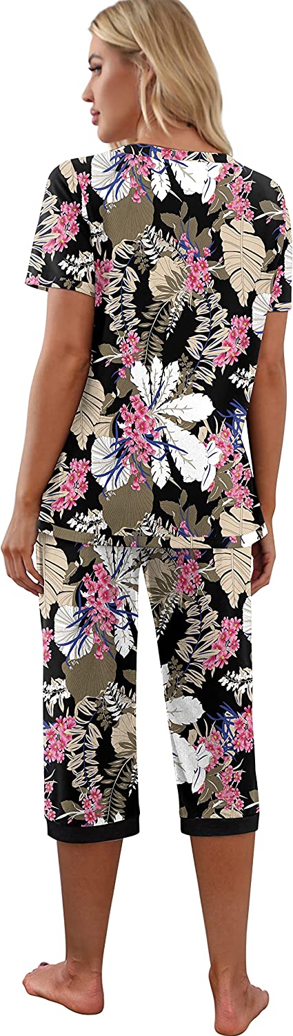 PrinStory Women's Pajama Set Short Sleeve Shirt and Capri Pants Sleepwear Pjs Sets with Pockets