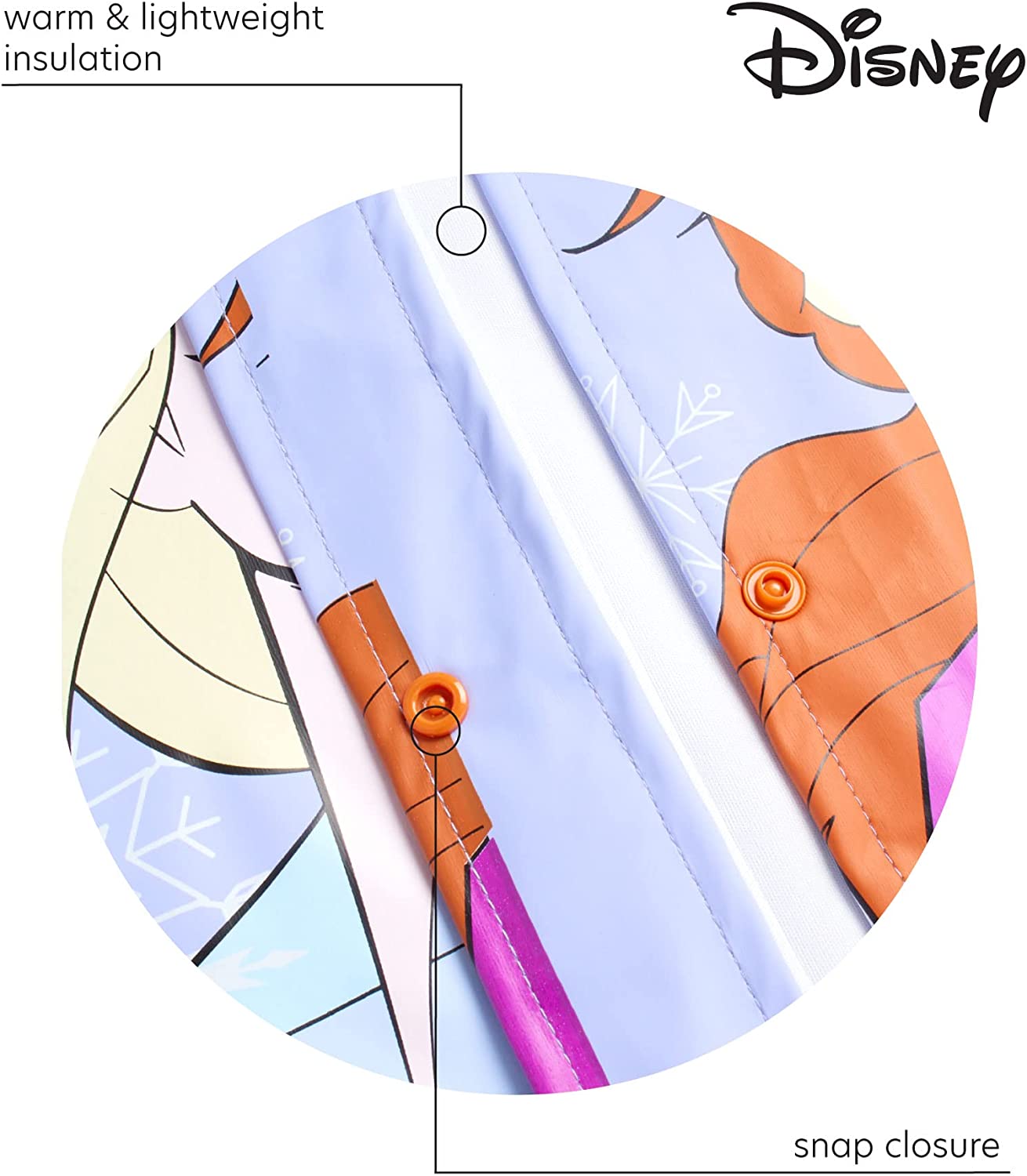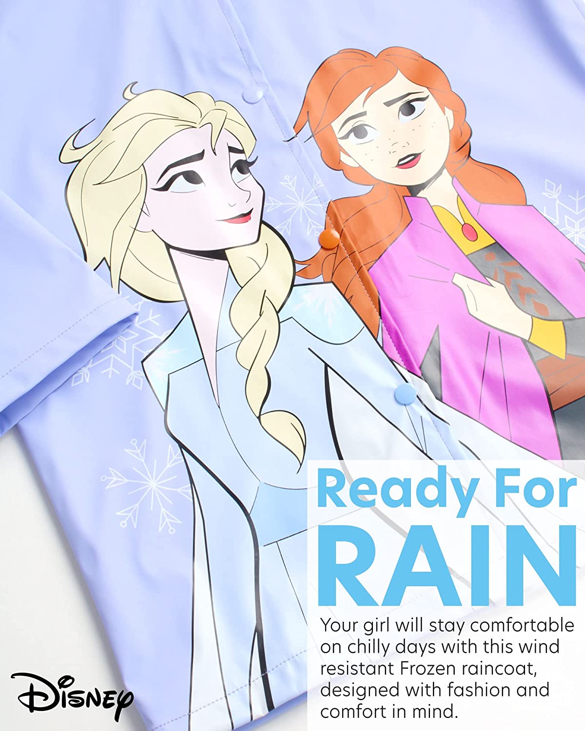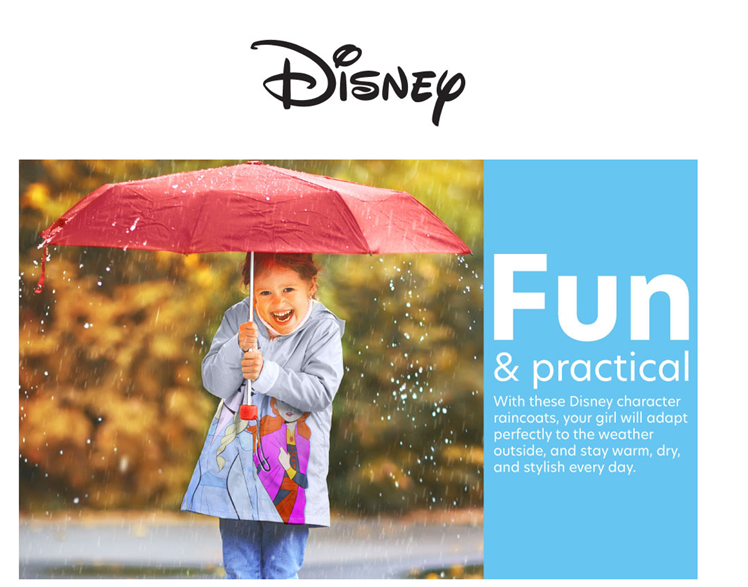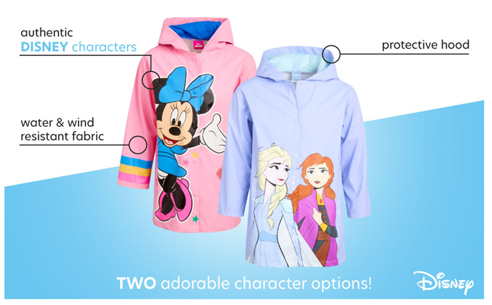 • GIRLS' DISNEY RAINCOAT: This multipurpose and versatile Disney raincoat is a must-have for your baby girl that will help her stay safe from the elements when the weather changes suddenly; Perfect jacket for all little fans of the Disney cartoons and characters, featuring a big and vibrant Minnie Mouse print or Frozen princesses, Elsa and Anna