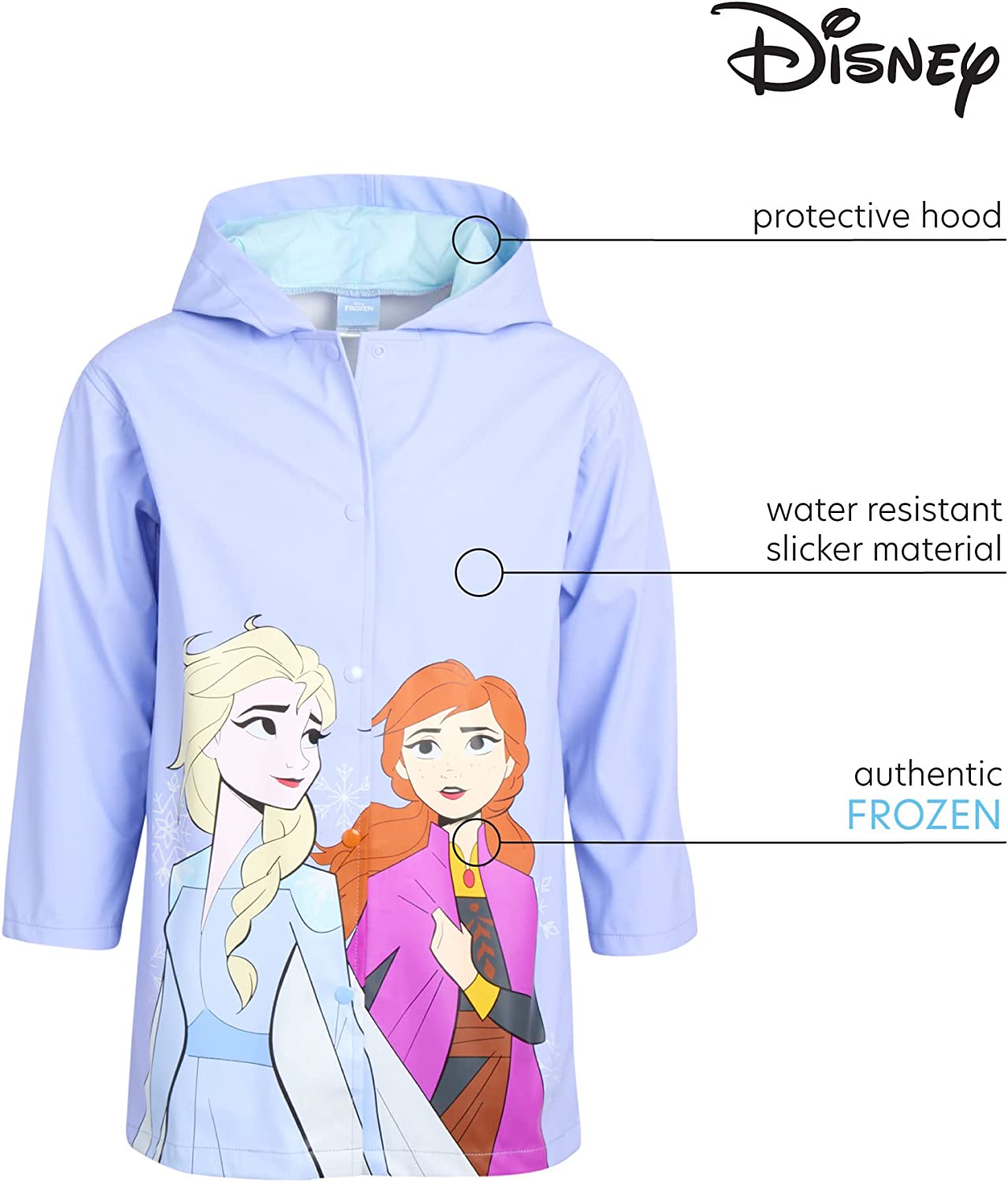 • DURABLE FROZEN JACKET: We fashioned this girls' coat from wind and water resistant fabric that will ensure your daughter stays comfortable when the temperature drops; Great waterproof jacket for everyday wear, preschool, and outdoor play in the rain; Our Disney raincoat is perfect for every baby girl who loves Frozen, Elsa, and Anna