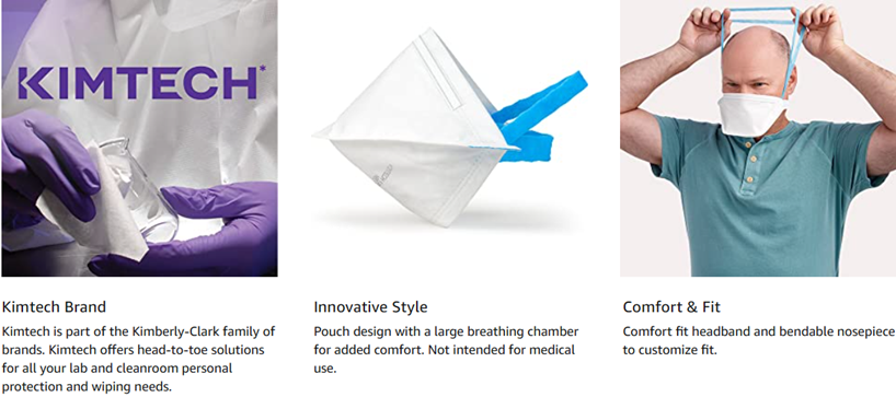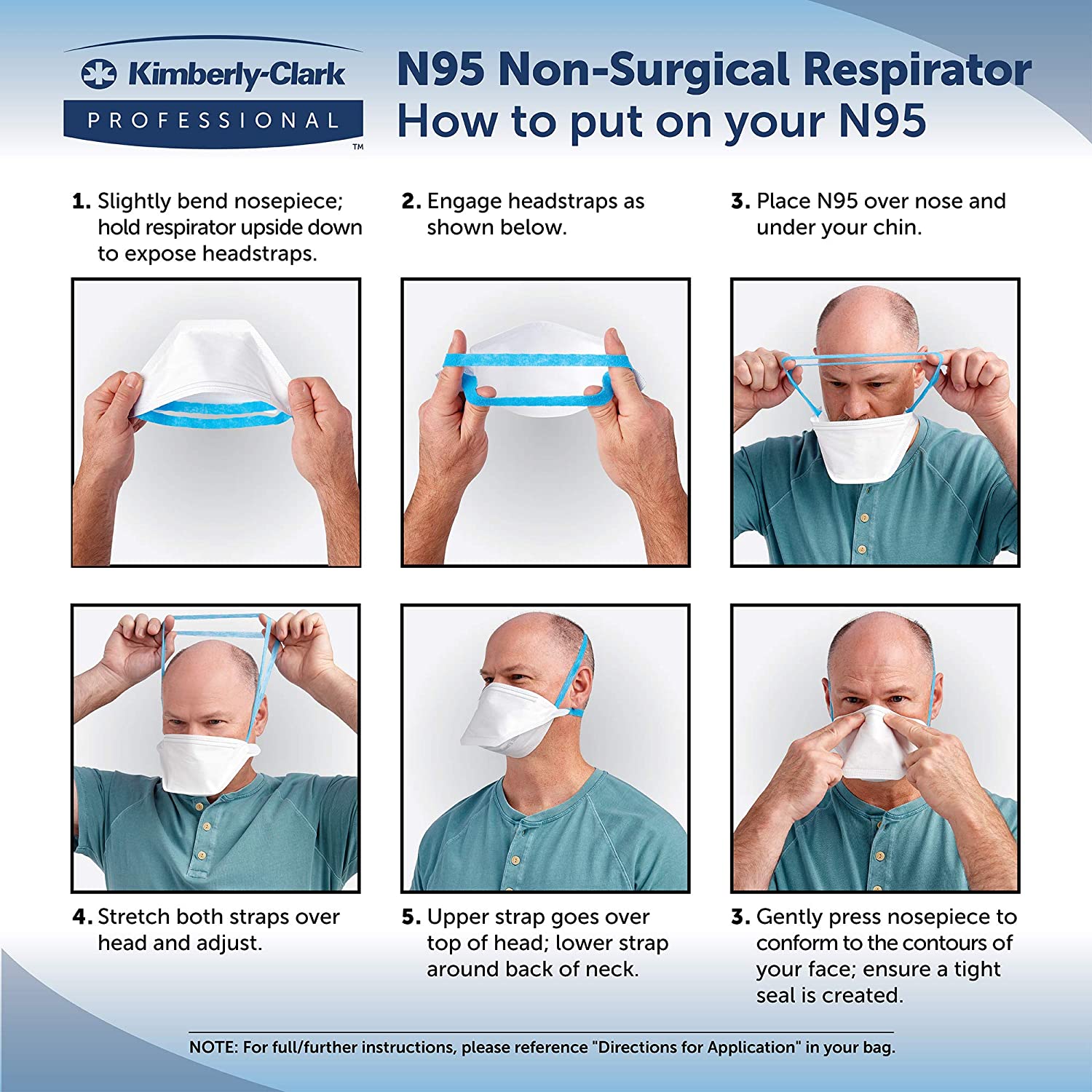 • 50 Kimtech N95 Pouch Respirators made by Kimberly-Clark, Bulk packaged in bag, Regular Size, White respirator with 2 blue headbands