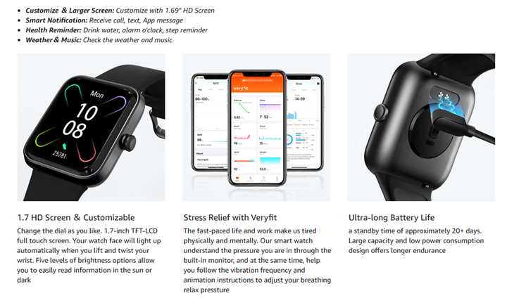 • 【1-Year Warranty Promised & Wide Compatibility】Compatible with iPhone, Samsung etc., built-in BLE5.0 and 300mAh lithium-ion battery. Our free APP "VeryFit" supports iOS 9.0 / Android 6.0 or above smartphones. If you have any questions, please don’t hesitate to contact us with any problem