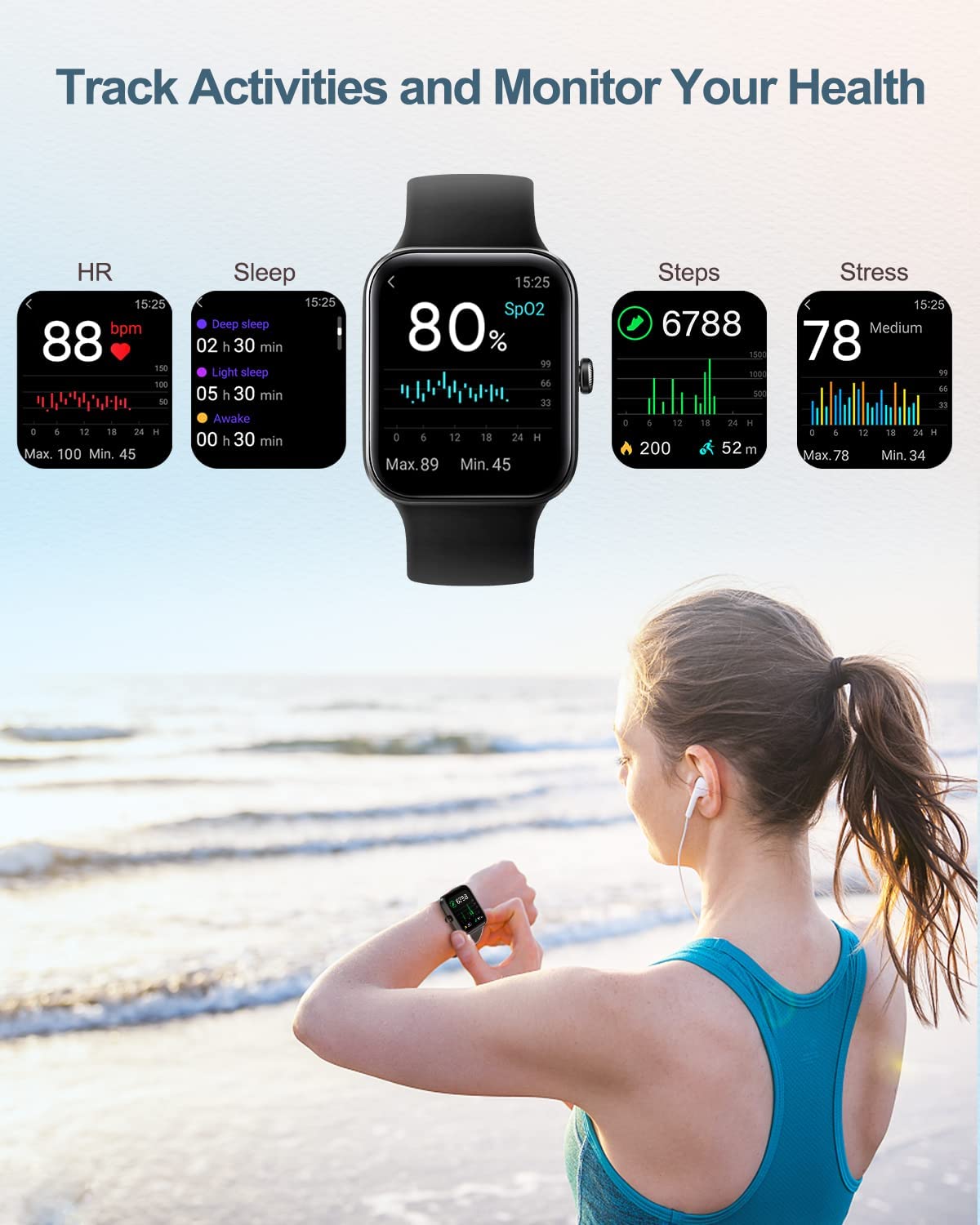 • 【Smart Life Partner】Check daily workout clearly on a 1.69'' HD bright color display. Create customized fitness schedules and goals, Get vibration alerts for all notifications, including phone calls, texts, and social media app alerts. Never miss a message with smart notifications delivered right to your wrist. You also can check real-time weather and change your music on the smartwatch