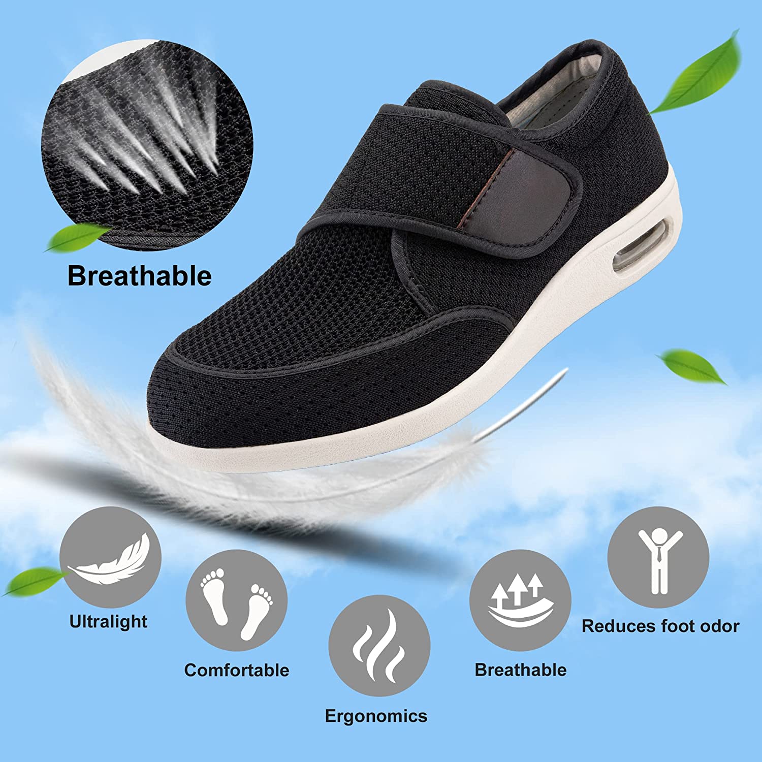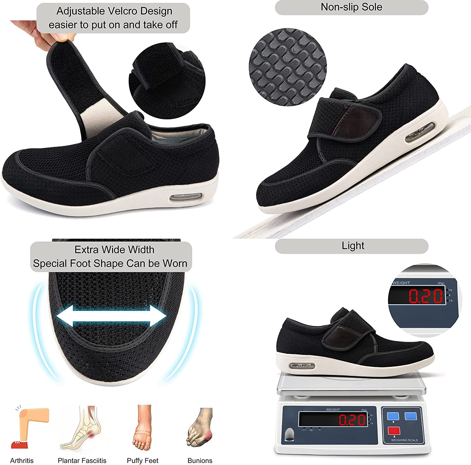 • 【Comfortable Swollen Feet Shoes】 : The diabetic shoes for men have a unique velcro design, free adjustment for different instep height. The lining can be pulled to the toes, so that your swollen feet can easily wear into the shoes, perfect fit for edema and swollen feet.