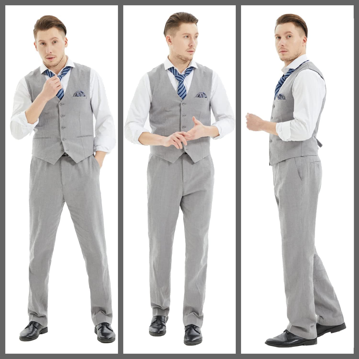 - FEATURE--Vest:Four Button,V-Neck,Smooth Back And Adjustable Back Tie,Slim Fit Style;Pants:Flat Front,Zippered Fly,Button End And Adjustable Waist Tab.