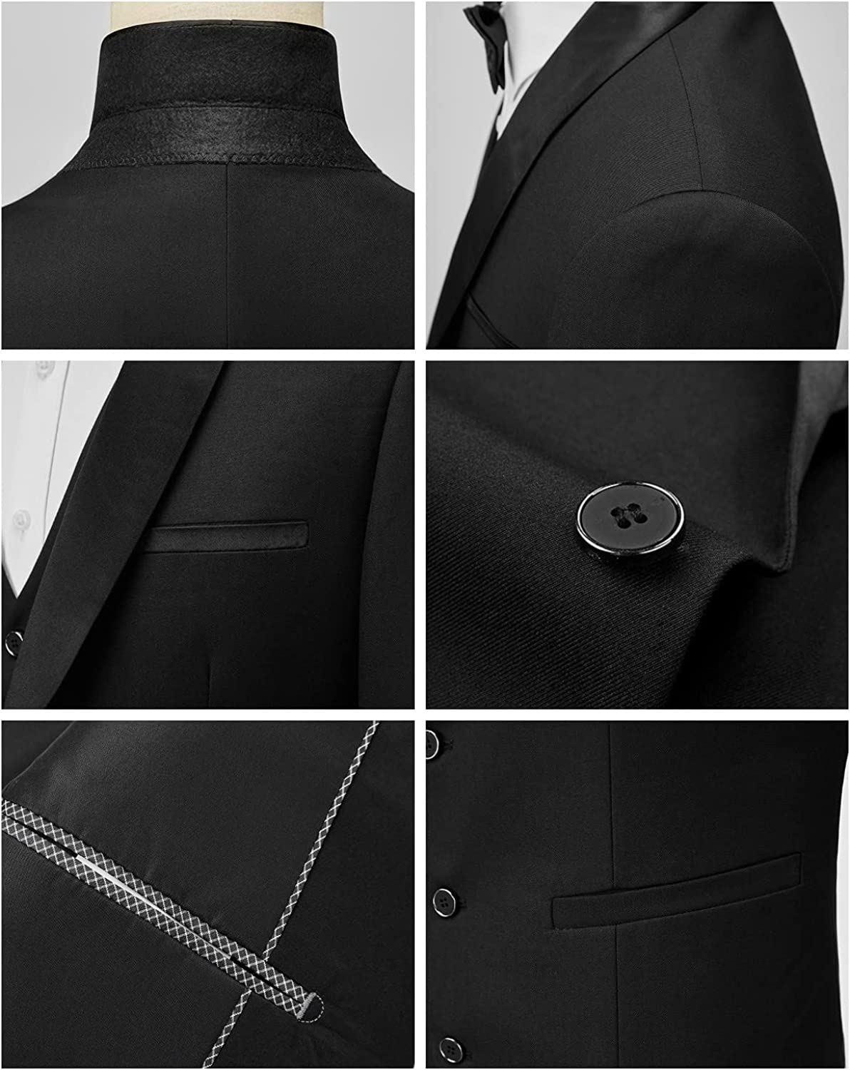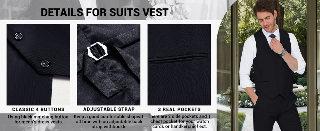 • 【FEATURE】Blazer:One Button Closure,Single Breasted,Shawl Lapel,Side Vents,Slim Fit Style;Vests:Four Button,V-Neck,Smooth Back And Adjustable Back Tie;Pants:Flat Front,Zippered Fly,Button End And Adjustable Waist Tab.