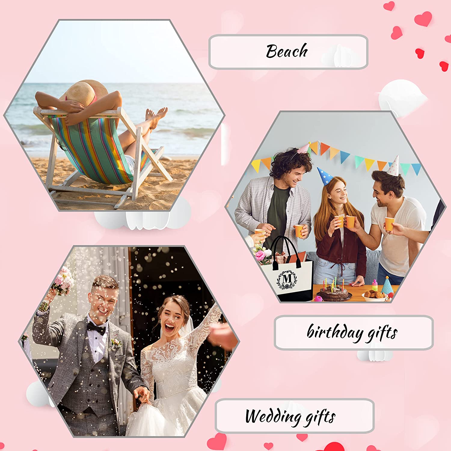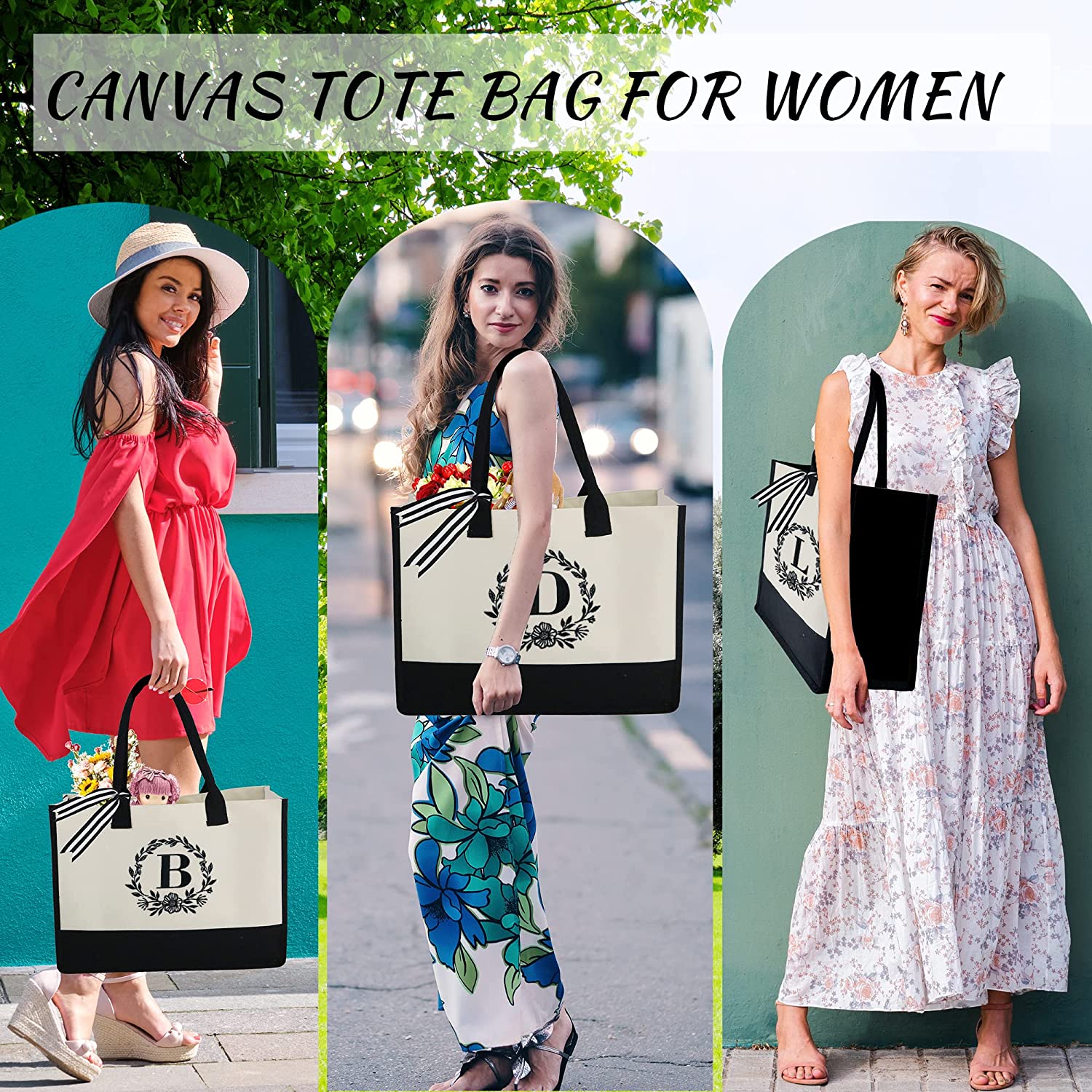 • Multi Purpose & Multi Occasions: Our tote bag for women is great for many items, like laptop, towels, water bottle, clothes, file, etc. The canvas bag is suitable for many occasions, such as beach, wedding, work, bridal shower, women gifts, birthday gifts, Mother's Day gifts for mom, Teacher's Day gifts, grocery shopping, etc.