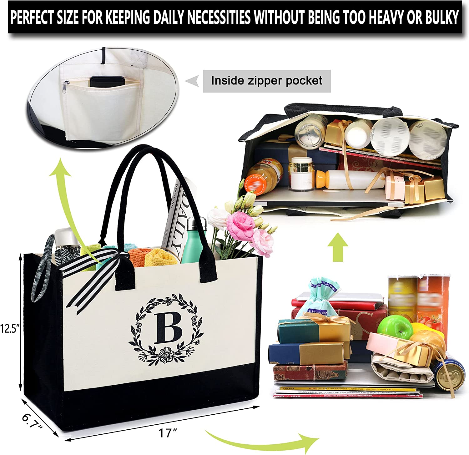 BeeGreen Initial Canvas Tote Bag with Zipper Pocket 13OZ Embroidery Monogrammed Personalized Birthday Gifts for Women