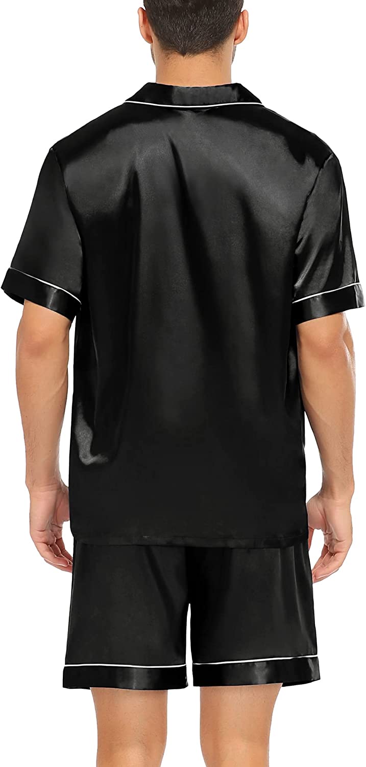 - FEATURES - Silky satin 2 piece Pjs set with short sleeved button-down top and elastic waist pants, easy to put on and off. Classic notch collar, chest pocket lend sophisticated detail. Two sided pockets to place your phone and wallet. Enjoy the sleep peacefully, and the life that occupy the home.