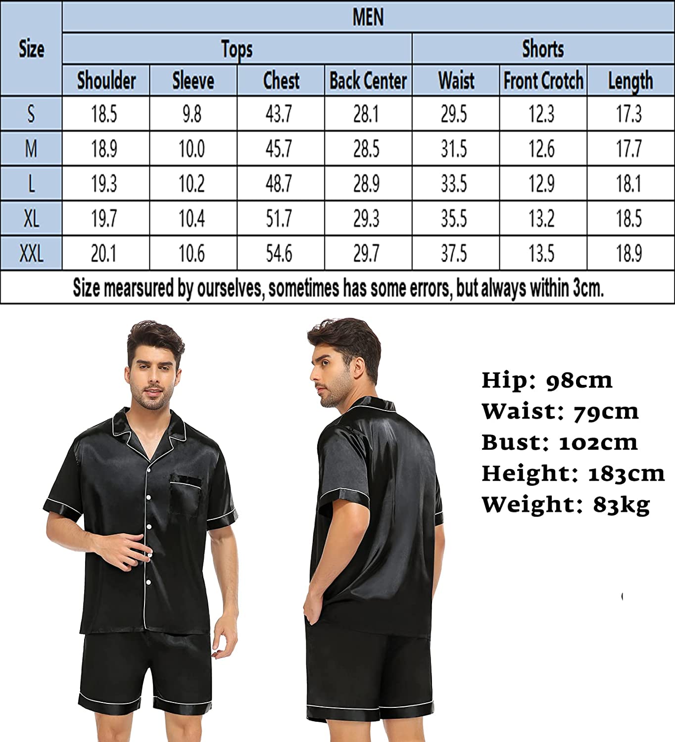 - Model SIZE - Height 183 cm; Weight 83 kg; Bust 102cm; Waist 79cm; Hip 98cm (Size: L). More measurements please refer to the size chart on description before ordering.