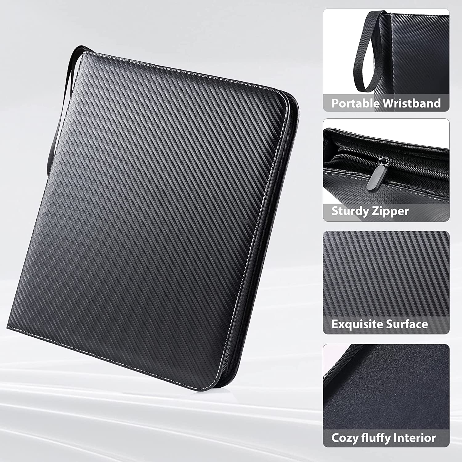 • ?【Full Protections】 Top-loading design of card sleeves are conducive for card insertion and prevent your cards from falling or beverage infiltration. Smooth zipper benefits to zip up or expand, again preventing card from slip off and protecting privacy. Portable wristband supports you to take the card binder wherever you need. Comprehensive Details.