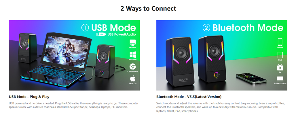 - 【Plug and Play】USB powered and no drivers needed. Plug the USB cable, then everything is ready to go. You can choose to use wireless mode or wired mode. These computer speakers work with a device that has a standard USB port for pc, desktops, laptops, PC, monitors, TV, etc. Of course, double-press the knob easily to switch to Bluetooth mode for your device.