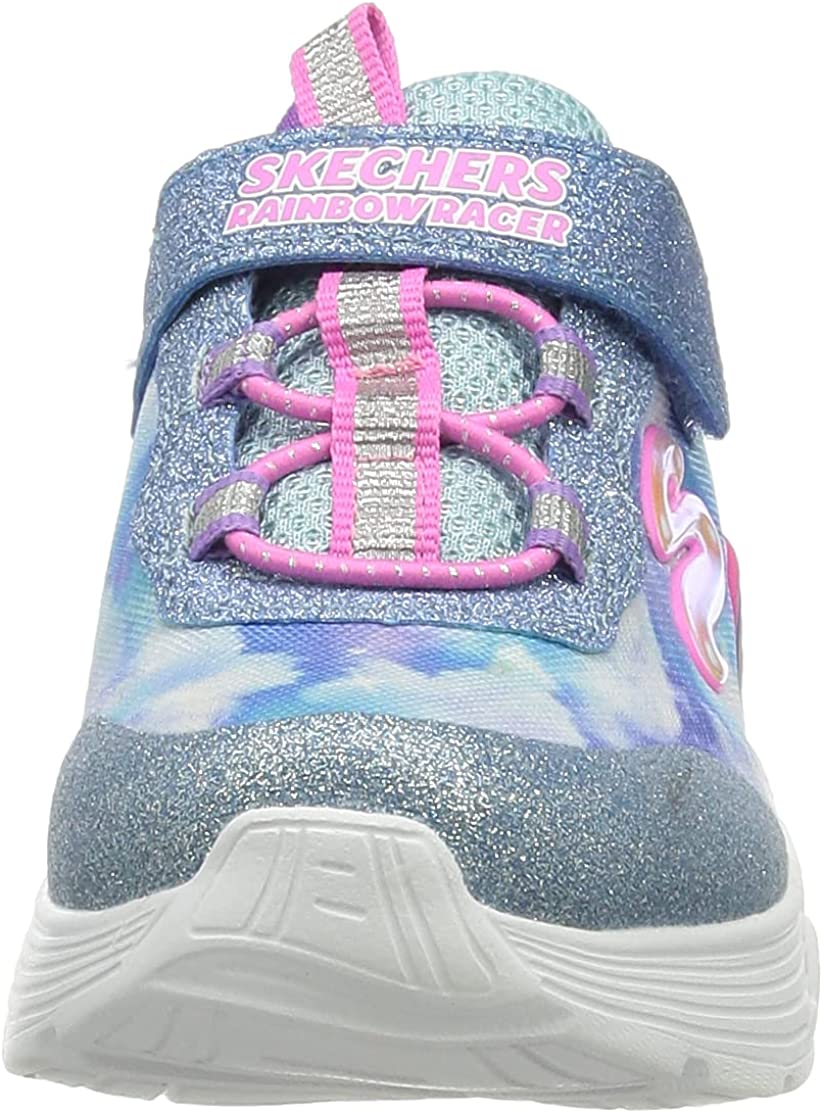 Brighten up the day in fun sporty style with the Skechers Rainbow Racer Lights(TM) shoe. This casual lightweight slip-on sneaker features a breathable athletic mesh and smooth synthetic upper with a fun rainbow cloud sculpted light-up midsole.
