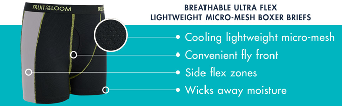 Fruit of the Loom breathable ultra flex boxer briefs feature micro-mesh fabric that promotes air flow, preventing your song from getting hot. These boxer briefs have flexible side panels so they will move with him. The flex panels stretch, making them ideal for your growing boy, fitting him through growth spurts.