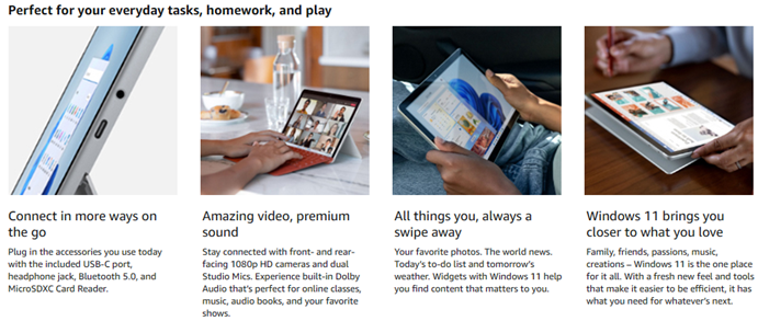* Some accessories and software sold separately. Available colors and materials may vary by market and configuration. 1. Up to 11 hours of battery life based on typical Surface device usage. Testing conducted by Microsoft in August 2021 using preproduction software and preproduction configurations of Surface Axton. Testing consisted of full battery discharge with a mixture of active use and modern standby. The active use portion consists of (1) a web browsing test accessing 8 popular websites over multiple open tabs, (2) a productivity test utilizing Microsoft Word, PowerPoint, Excel and Outlook, and (3) a portion of time with the device in use with idle applications. All settings were default except screen brightness was set to 150nits with Auto-Brightness disabled. Wi-Fi was connected to a network. Tested with Windows Version 11.0.22000.9 (21H2). Battery life varies significantly with settings, usage and other factors. (4) Weight not including Surface Go Type Cover. (5) Requires Microsoft 365 subscription, sold separately. (6) Windows Defender version 4.12 & 4.18 scored 100% detection for protection against 0-day malware attacks, inclusive of web and e-mail threats (Real-World Testing) by AV-Test, July and August, 2019. (7) OneDrive PC folder backup feature must be enabled by user and files must be saved in Desktop, Pictures, or Document folders available on Windows PC’s only.