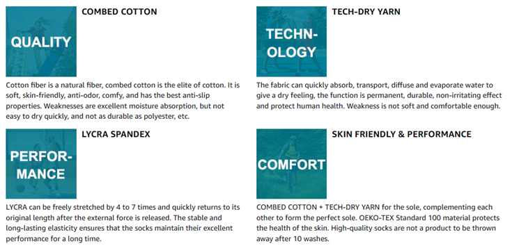 5. About Moisture-Wicking: There is a limit to the moisture wicking ability of socks, and if this limit is reached, drying is required to restore performance. Please feel free to explore and we look forward to hearing from you.