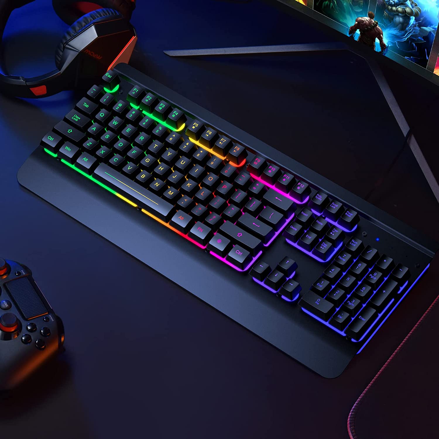 Dacoity Gaming Keyboard, 104 Keys All-Metal Panel, Rainbow LED Backlit Quiet Computer Keyboard, Wrist Rest, Multimedia Keys, Anti-ghosting Keys, Waterproof Light Up USB Wired Keyboard for PC Mac Xbox