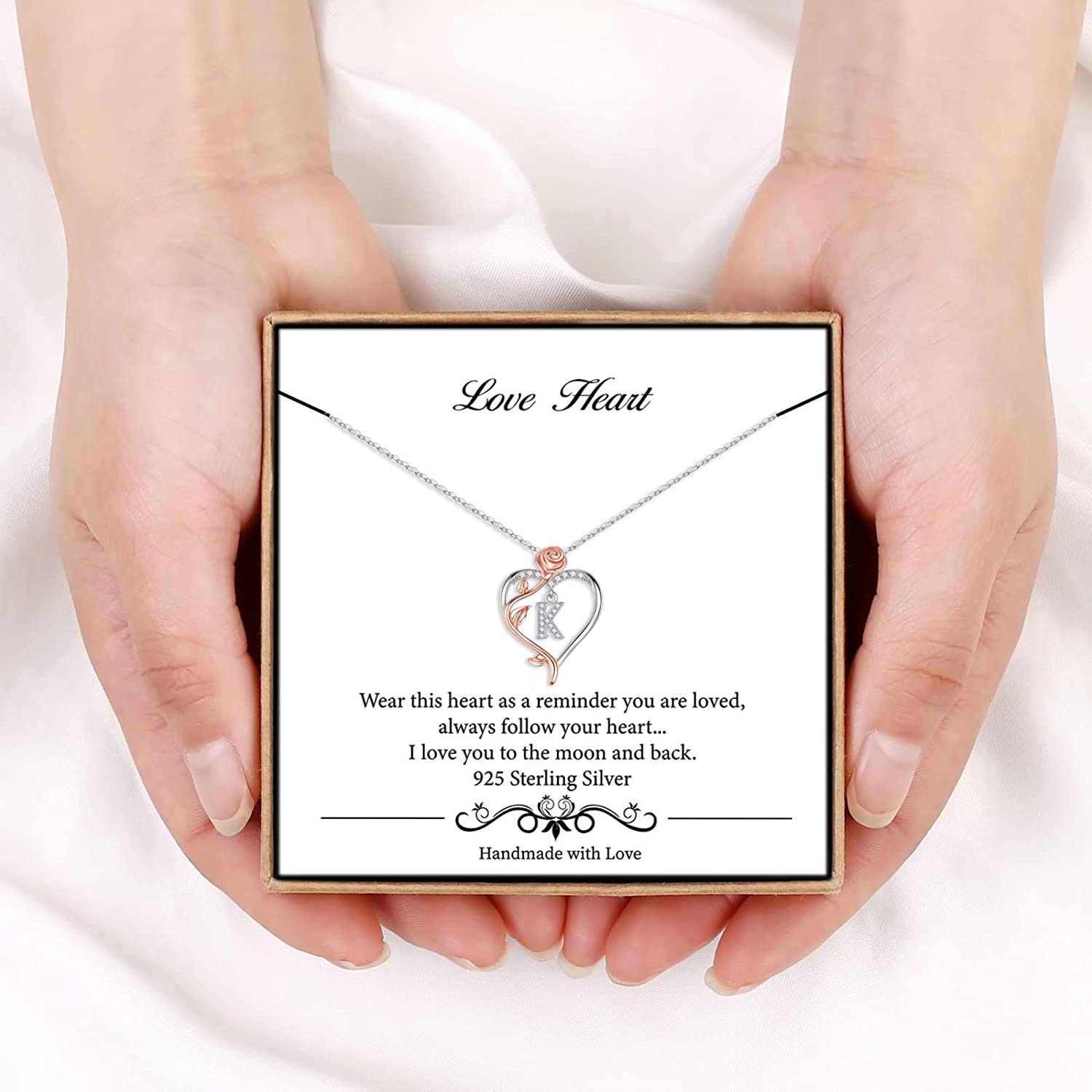 Iefil Rose Heart Necklaces Gifts for Women,925 Sterling Silver Rose Love Heart Initial Letter Pendant Necklace Jewelry Mothers Day Valentines Anniversary Birthday Gifts for Her Mom Wife Girlfriend