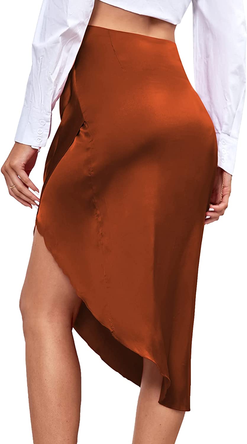 LYANER Women's Satin Skily Asymmetrical Split Slit Ruched Hight Waist Bodycon Midi Skirt