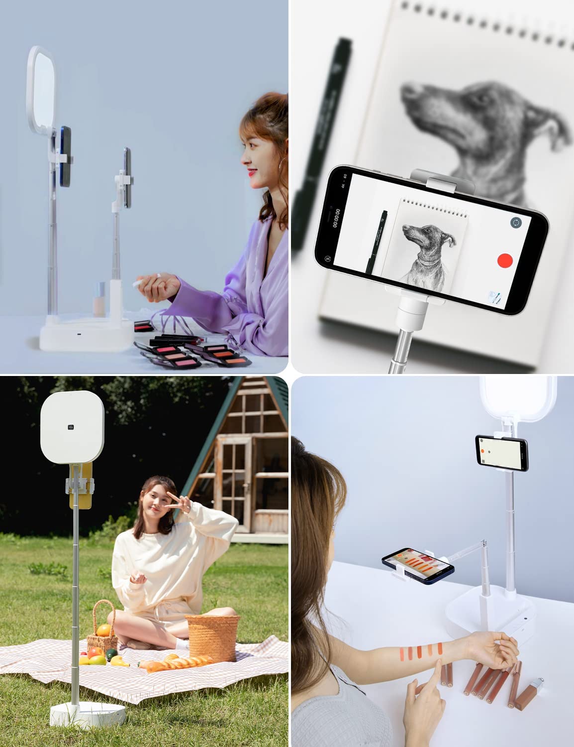 [Adjustable& 360° Rotation] Main pole height adjsutable up to 35'' , front holder can be extended up to 22", used as a floor stand or desktkop selfie stand occasions. 360° rotate phone clamp and 180° rotate light board, easily to switch between different angle to match your shooting angle needs .The joint of front holder is 90° bendable which supports overhead recording.
