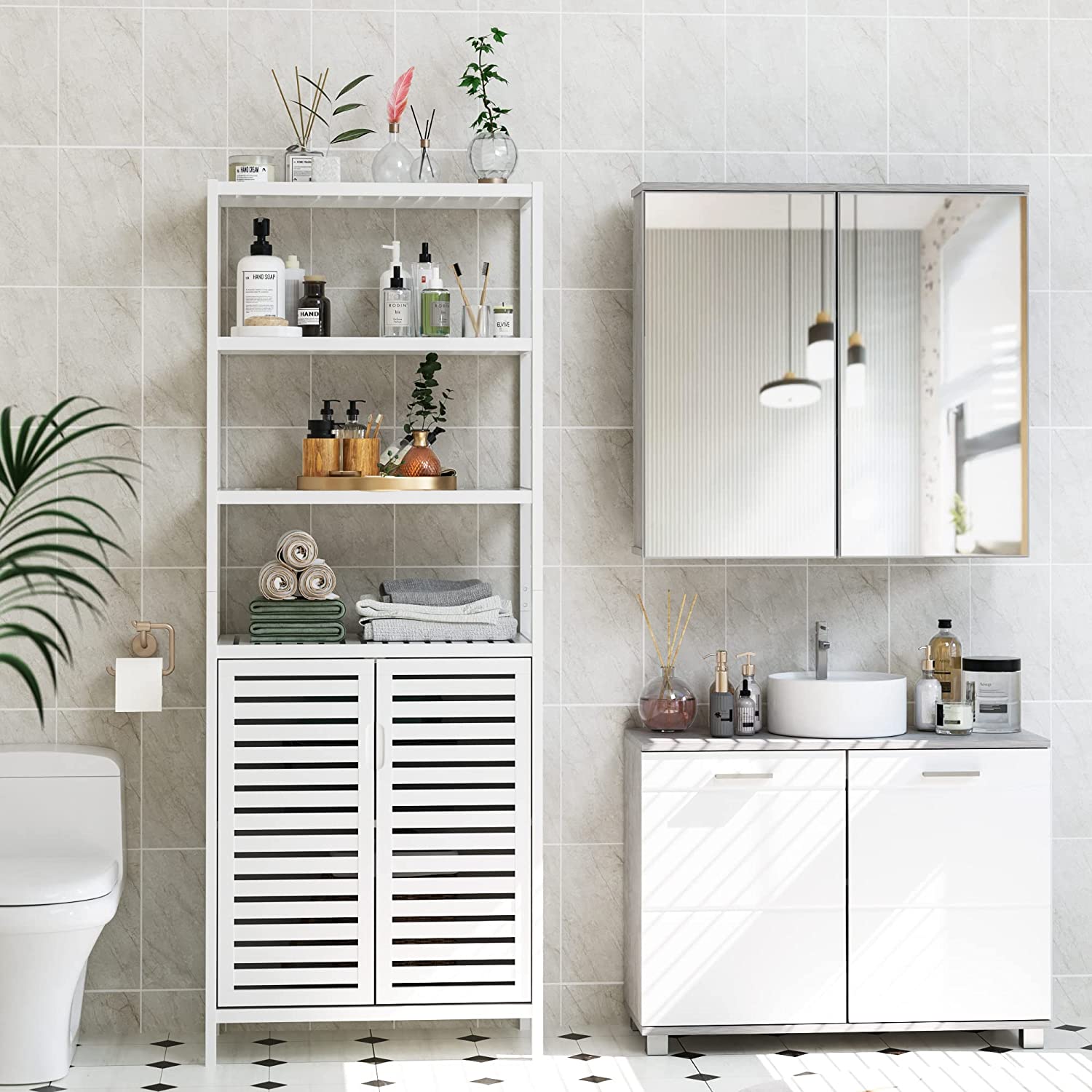 AMPLE STORAGE SPACE: This bathroom storage cabinet is an integrated cabinet with 4 open shelves and a double-door storage cabinet that provide ample storage space for your daily