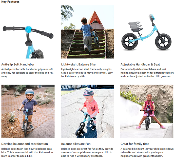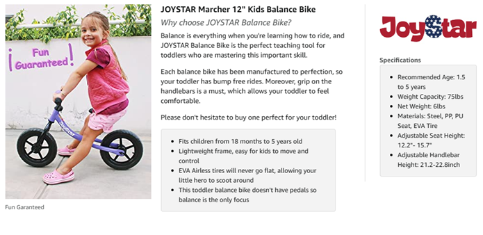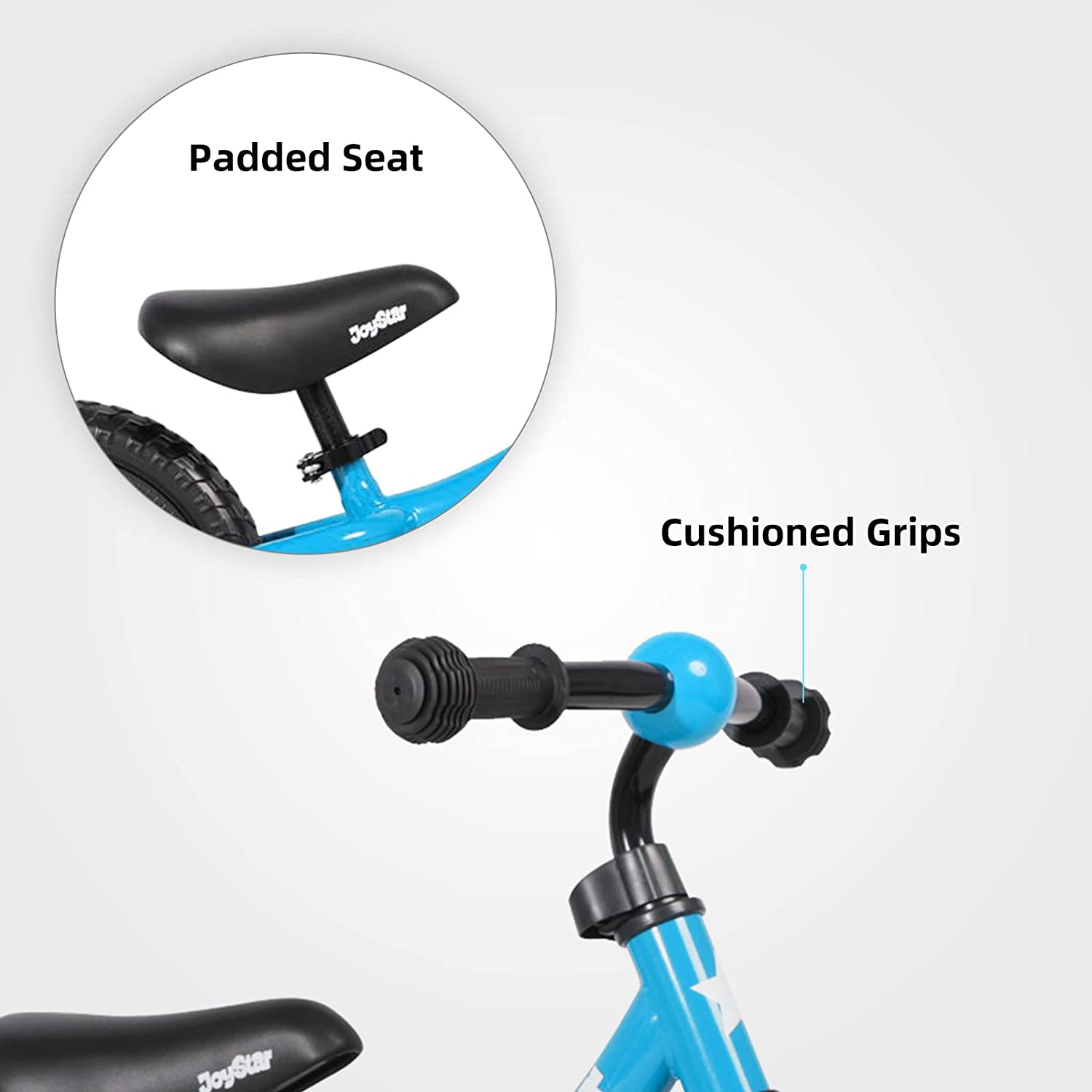 • ❤BEST GIFT FOR KIDS - JOYSTAR Marcher Kids Balance Bike is a pedal-free beginner bike that allows toddlers to focus on balance. With a low-rise frame, EVA foam wheels, soft rubber grips and a soft saddle, this is the best starter bike you can give any budding biker to create the ultimate first ride.