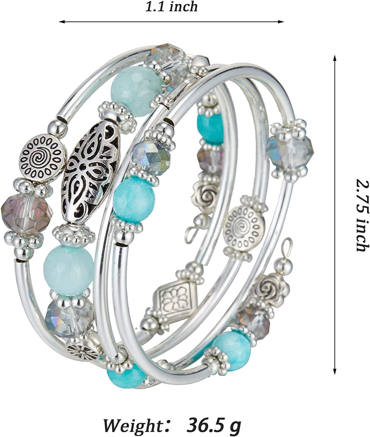- Perfect Size: The diameter size of this silver bracelet is2.4 inches (6cm), it's the perfect size. The way to wear this wrap bracelet is very simple and convenient, just winding the wristband on the wrist layer by layer, also stay firm while wearing. Weight: 36.4g (0.08lb), there is no burden to wear this crystal bracelet on the wrist