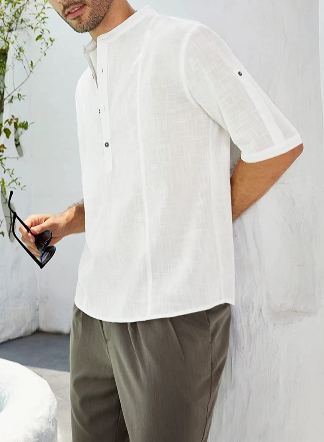 Fashion Design: Casual henley collar shirts for men,band collar, in a casual stylish, it has a button at the cuffs so you can adjust the length of the sleeves flexibly. Usually white shirt and blue shirt is the choice of most people,it is summer's color.