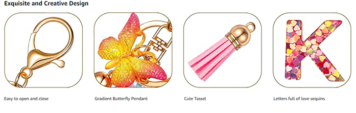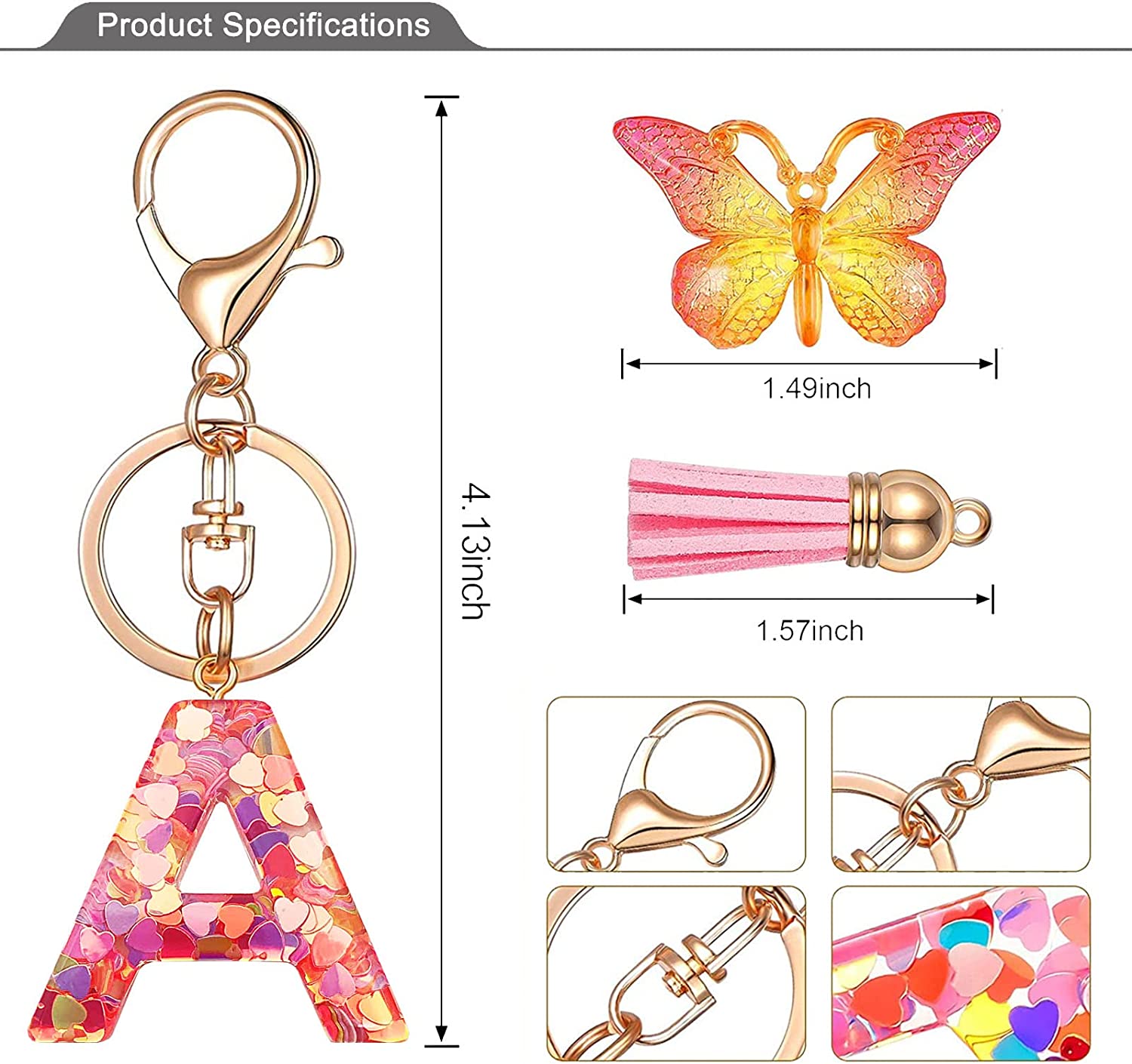 • ?【High Quality Keychain】This cute pink butterfly tassel resin letter keychain is made of high quality epoxy resin material, the key ring is made of high quality rose alloy electroplating, the resin letters are added with love sequins, very shiny, resin material High hardness, no deformation, no fracture.