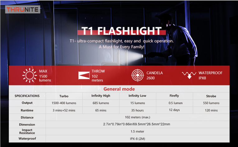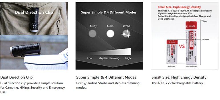 | Included Components | Spare O-rings x2, USB Charging Cable x1, Pocket clip x1, Spare USB Rubber Cover x1, ThruNite battery x1, Lanyard x1 |