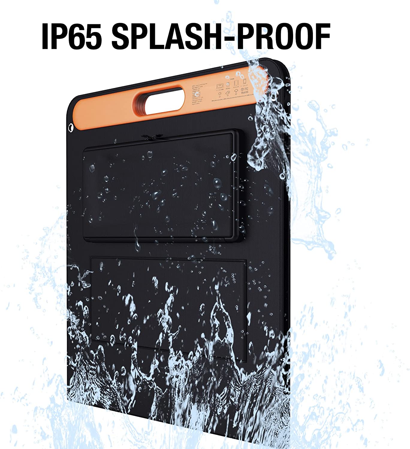 It is IP65 splash-proof that will protect from water splashing (Do not place it under the rain, or to soak in water for a long time). The zippers on the pocket can hold the power cords, and cover the power port.