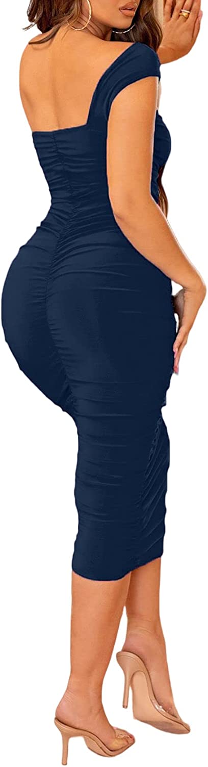 Feature: Sleeveless, adjustable one shoulder/off shoulder, ruched back, slim fitting, midi length, solid color, suitable for most body shape, make you looks more sexy and elegant