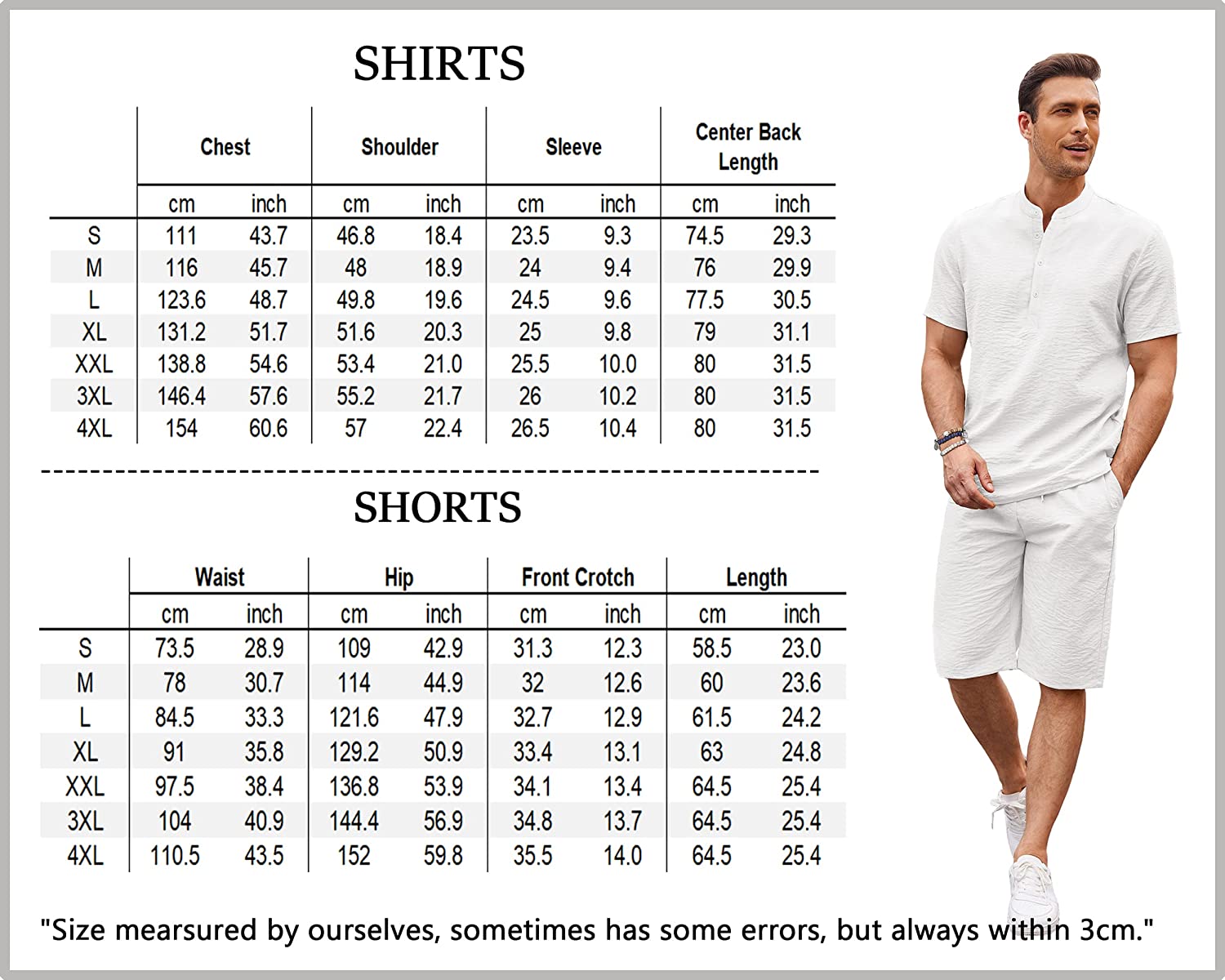 Men's Henley Shirts featuring with henley neck, button closure and beach 10 inch shorts with elastic waist with adjustable drawstring, 2 slant pockets and back pocket perfect for storing phones, sunglasses or gadgets.