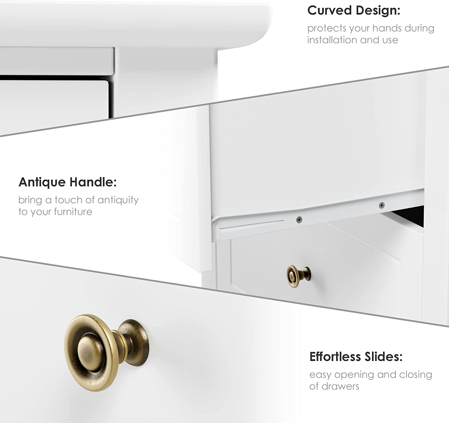 • 〖 EXQUISITE & COMFORTABLE 〗The four corners of the top of chest of drawers are provided with curved arcs to avoid accidental injury during installation and use. The handle is also exquisitely polished, and we always pay attention to the exquisiteness and comfortable use of the product.