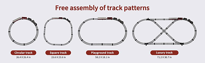 - You will play in any occasions: is fit for most family Christmas trees and any table during Festival ,Assemble the modular rail track parts into your own railroad shape and layout,then place the hooked train sets on the tracks precisely, finally turn on the switch, the train set will move on the track steadily, smoothly. Great gift for birthday and christmas gift for boys & girls.