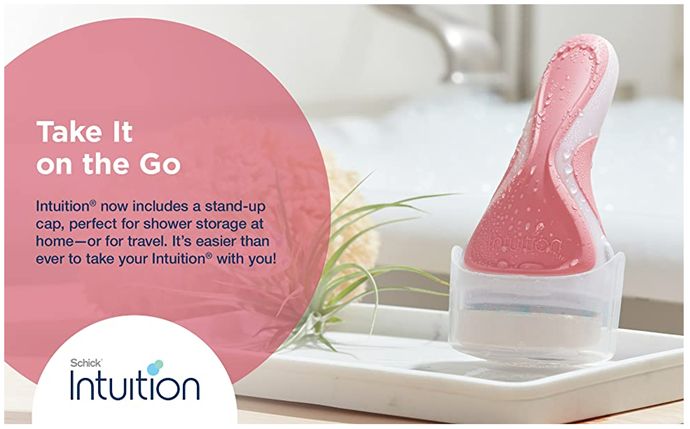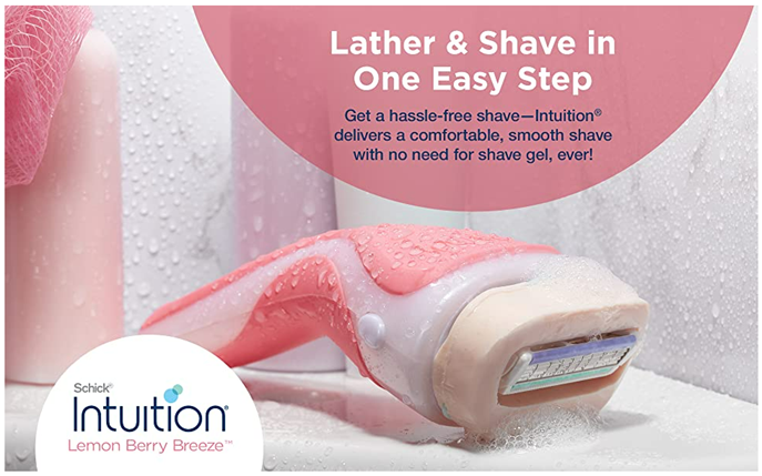 The Schick Intuition Pure Nourishment Razor lathers and shaves in one easy step, with no need for shave gel! This razor for women features a built-in moisturizing bar made with natural fragrances and organic cocoa butter. Its smooth-gliding 4-blade cartridge has a pivoting head to hug the contours of your legs and body. Plus, Schick Intuition Razors are perfect for first-time shavers, minimizing nicks and cuts.