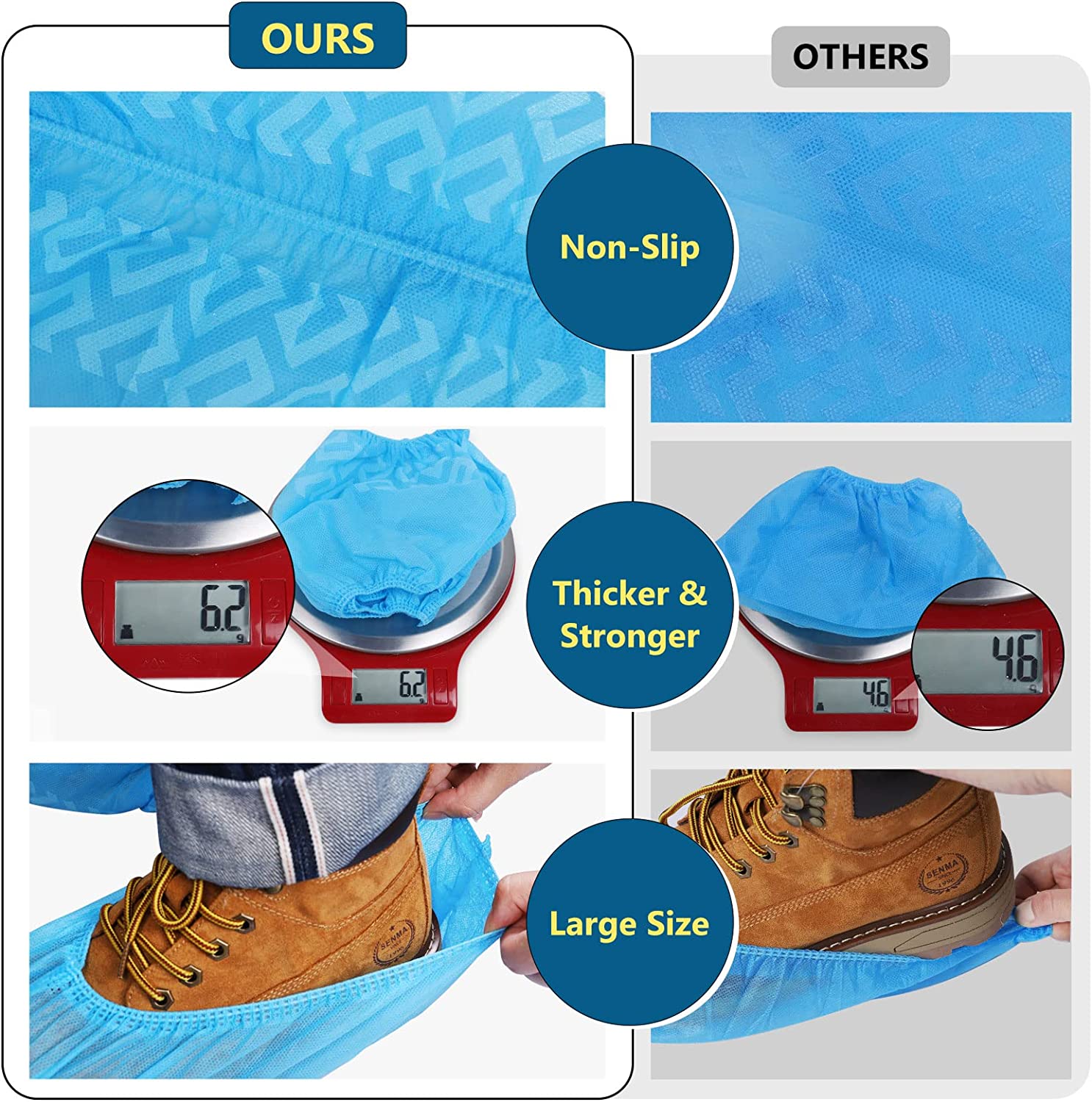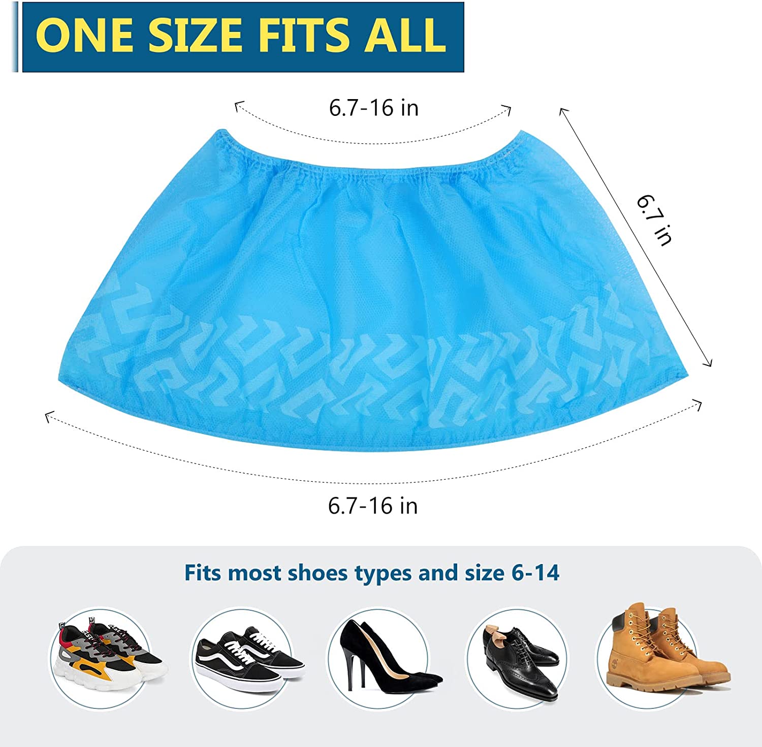 • Larger Size: Stretchable size about 16.9" in length, 6.7"(W), shoe covers contain an elastic band for flexibility, suitable for shoes size 6-14 (upto US Men's work boots 12).