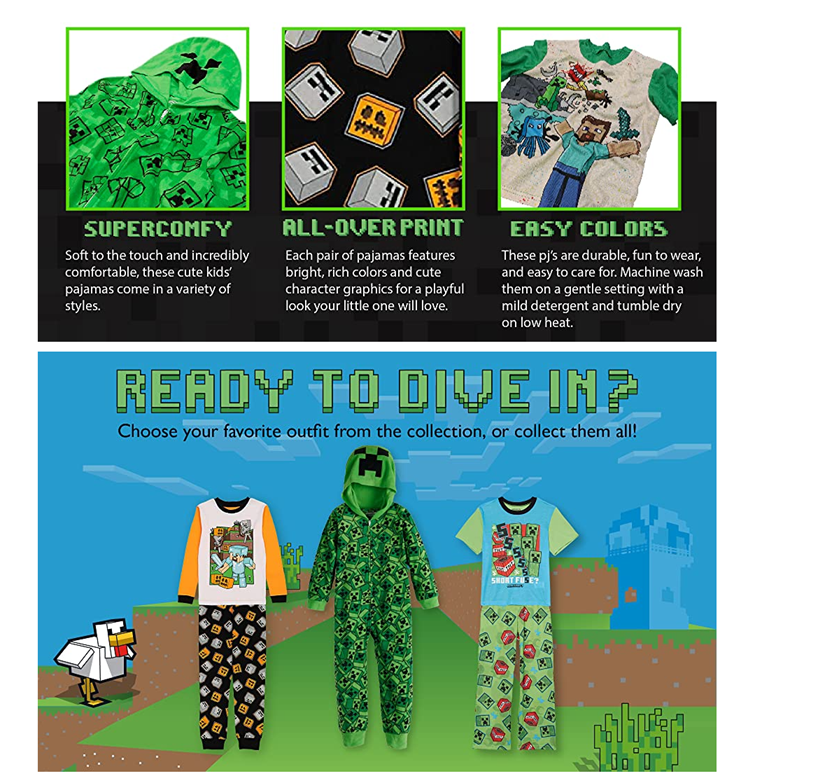- ENJOYABLE BEDTIME: These fun “Minecraft” pajamas for boys come in a variety of styles and feature charming graphics and bright colors. These boys’ short-sleeve pajamas are available in sizes 4–12.